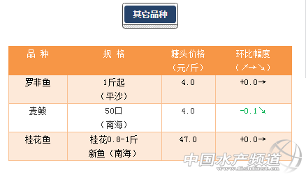 中國水產頻道原創報道, 文/ 珠海海龍 水產前沿 吳佳輝 海水特種魚:海鱸級魚需求大,后市看漲鱸魚 本周鱸魚中大魚級別有所回升,級魚需求較大,后市看好級魚價格上漲。 立魚 珠海小林:市場出魚量增加,存塘量大,客戶想快速出魚干塘,上市以大規格立魚為主(5兩上)。市場病害較多,客戶恐慌性出魚,預計后市魚價下跌。 珠海斗門:行情穩定。 盲曹:雖然近期多頭箍出魚,但是依舊缺魚,價格保持穩定。 黃花:級魚8.6元,中大魚成數越高價格隨之下降,雖今年放苗少,但珠三角地區受鱸魚存塘多沖擊,價格趨于穩定。 【關鍵字】:海水魚 價格行情 水產養殖 |