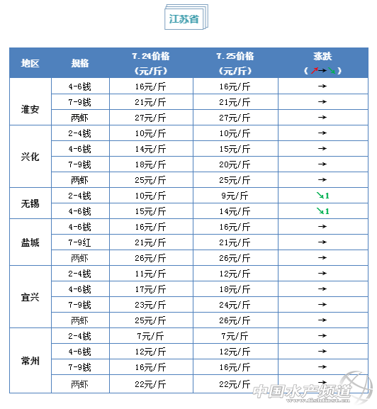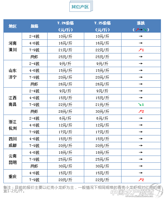 | 中國水產頻道原創報道, 小龍蝦上市正當時 全國小龍蝦行情解析 水產前沿與您每周相約 文/ 水產前沿 鄭鵬飛 最近各地氣溫明顯升高,洪澤湖在持續高溫少雨的天氣影響下水位嚴重下降,周邊的10萬多畝圍網養殖出現大面積死魚,損失達數億元。目前周邊大面積魚、蝦、蟹塘正處于缺水狀態,很多養殖戶只能靠井水救急。 最近半個月以來,湖北武漢地區的氣溫一路攀升,目前白天最高氣溫達到了37℃。隨著氣溫的升高,蝦塘里的小龍蝦開始打洞以躲避高溫,后期小龍蝦的捕撈難度也會更加困難。小龍蝦的價格行情在經歷了前幾天的暴跌之后,今天多個地區批發價出現反彈。目前湖北武漢1兩以上的小龍蝦批發價已經回到28元/斤,洪湖、仙桃、監利等多個地區價格也都出現了上漲。 |