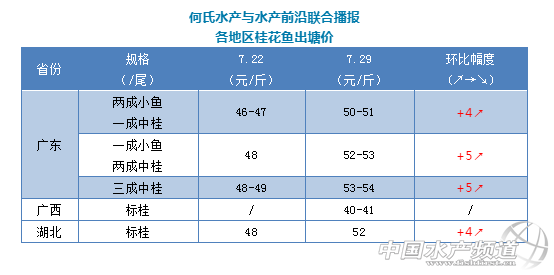 | 中國水產(chǎn)頻道原創(chuàng)報道, 文/圖 何氏水產(chǎn)、水產(chǎn)前沿 李靜 桂花魚 1、本周廣東桂魚老魚價格出現(xiàn)暴漲,最高升幅超5元/斤,目前最適合客戶規(guī)格的魚(3成中桂,0.5成小魚)價格在54元/斤左右,個別好規(guī)格的魚開塘價訂到55元/斤,偏小點的魚價格在50-51元/斤左右,實際成交價格還要看魚的規(guī)格比例來定。目前存塘老魚基本結(jié)束了,只是個別產(chǎn)區(qū)還有1-2塘,規(guī)格都是以偏大為主。現(xiàn)在由于桂魚老魚存塘量嚴(yán)重緊缺,沒法滿足市場偏大魚銷量,桂魚新魚開始上市但數(shù)量不多、規(guī)格也不大,最大的魚頭只有1.1-1.2斤沒有偏大魚,導(dǎo)致部分城市桂魚供應(yīng)暫停。預(yù)計新魚陸續(xù)上市,偏小魚價格可能會有小幅下跌,偏大魚暫時穩(wěn)定,等老魚結(jié)束后,新魚開塘價格還會有小幅回落。 2、本周湖北地區(qū)標(biāo)桂價格同上周相比上漲了4元/斤,銷量比上周少,老魚基本結(jié)束了。 |
