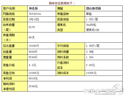 | 中國水產頻道報道, 好飼料加好策略助力網箱草魚養殖,每噸飼料凈增利潤2548元 文/圖 天邦食品股份有限公司 王璽嶺 近一年時間來,草魚行情可以說滑至低谷,加上草魚養殖的病害愈加復雜,草魚養殖戶的信心備受打擊,紛紛退出或轉養。 但有一位草魚養殖戶卻極為淡定,前段時間他養的草魚又上市了,而且又賺錢了。 他就是微山魯橋鎮的仲老板。仲老板從事網箱養殖草魚多年,養殖經驗豐富,他養殖的魚因發病少、皮毛好、體質好、耐運輸而深受購銷商的喜愛。 仲老板今年是3月中旬放魚9500斤,規格為1.8斤/尾。5月開始正式投喂七好全熟化精養淡水魚料,6月20日出魚,規格為2.85斤/尾,共計出魚15040斤,4.2元/斤,單個網箱凈利潤8918元。 仲老板認為,今年前期魚價太低迷,要是魚價再高點,如果能漲到4.6元/斤,一斤魚就能掙2塊錢,那他一個網箱養殖90天就可以賺1.1萬元,效益十分可觀。 仲老板為什么能在行情不好時仍然如此淡定,筆者在調查后發現了其中的奧秘。 出魚現場 眾所周知,穩定的水質是影響網箱養殖成功與否的重要因素,而仲老板深信“好料好調水”這一信條,因此他在選擇飼料的時候做了全面的調查和對比,最終他將目光定在了天邦七好全熟化飼料上。 “據我了解,天邦七好全熟化飼料采用高溫全熟化工藝,適口性、攝食率及消化利用率大幅提高,同時高溫殺滅99%以上的細菌,大大減少病原,更健康更高產!”仲老板說到,“而且天邦七好全熟化料經過高溫膨化,表面光潔無粉末,我們做過對比,天邦七好全熟化料在水中浸泡時間可超過12小時,不散開、溶失少,對水質的污染較普通飼料大大減少,魚體質好、發病少、成活率高,一年能賣兩次魚。” “前段時間草魚行情不太理想,但是只要能降低成本,減少發病率,仍然能有不錯的收益。其中飼料是最大的成本投入,而天邦七好全熟化飼料在降本增效方面效果顯著,是抵御行情低迷的法寶。”仲老板常說的一句話就是天邦七好全熟化飼料長魚快,看得見,不壞水,皮毛好。在仲老板看來,用好料,用對料,是降低成本的,增加效益的重要手段。 天邦七好全熟化系列精養淡水魚料 除了用好飼料,在養殖規劃方面,仲老板也頗有自己的心得:在年后放大苗,用好料,餌料系數低,長魚快,趕在高溫期和疾病爆發高峰期之前賣魚,先一步獲得穩定而可靠的收益。出魚之后再放新苗,這樣在高溫期時網箱里的魚存量不多,糞便排放的少、污染少,從而對池塘的壓力也大幅降低,這樣的接力規劃,基本可以確保養殖長期穩定的長勢和收益。 |