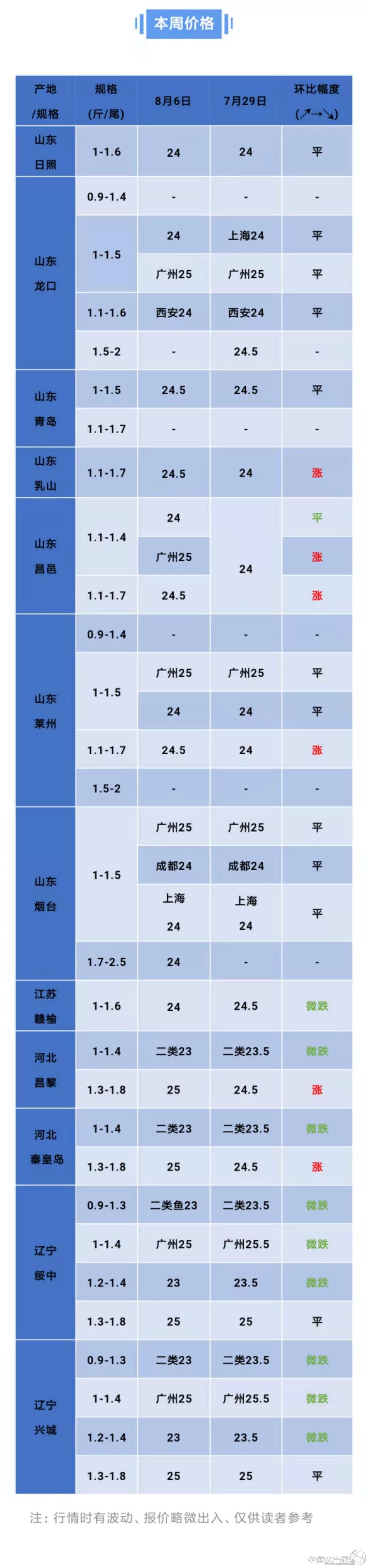 | 中國水產頻道原創報道, 隨節日臨近,部分地區有漲價苗頭。 文 | 表 工業化水產圈 實習編輯 張河長 本周行情 本周多地區魚價出現波動,山東部分地區出現漲價苗頭,其中昌邑地區的中標魚價格上漲了1元,北方部分地區的魚價有所下跌。流通商表示,最近出魚量穩定,供需關系較為平衡,隨著中秋等節假日的到來,多寶魚的需求量將會增加,預計會有漲價空間。業內人士建議養殖戶要理性看待行情,做好出魚規劃,讓多寶魚行業良性發展! 現在正處于高溫季節,多寶魚長勢快,喂料多,水環境的負擔增加,容易爆發疾病,如果有出現狀態不好的魚,需要及時隔離,做好病害的防治工作,同時也需要合理用藥,禁用藥物堅決不碰,現在國家對水產品的安全檢測工作正在逐步加強,不可存在僥幸心理。 希望所有的多寶魚養殖戶加強溝通,讓信息更通暢一些,每個人都能賣出高價,好價! |
