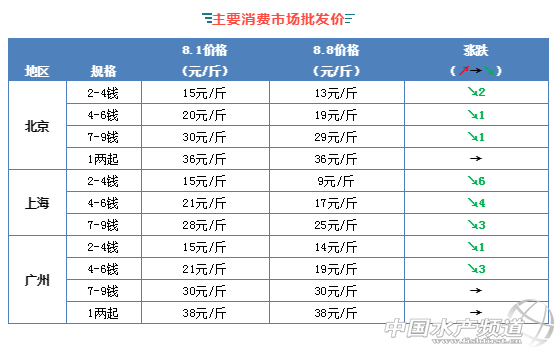 | 中國水產頻道原創報道, 小龍蝦上市正當時 全國小龍蝦行情解析 水產前沿與您每周相約 文/ 水產前沿 鄭鵬飛 養殖戶已開始搶苗 7月的最后一個星期內小龍蝦行情出現了一波大漲,突然暴漲的行情讓消費市場受到很大影響。有流通商表示,高溫導致小龍蝦打洞難以捕撈,目前收蝦很難,但是漲價也導致買蝦的也減少了很多。據了解,近期全國各地小龍蝦的批發價格出現了一波明顯回落。其中,北京、上海和廣州幾個主要消費城市價格下跌最為明顯,上海2-4錢的蝦從之前的15元/斤跌回到9元/斤,下跌6元/斤;云南、安徽、河南和湖南多個地區也是下滑比較明顯,安徽淮南地區7-9錢的蝦最新報價26元/斤,相比上周最高下跌了7元/斤,其他規格也有2-3元/斤的下滑。 不過接下來蝦會越來越少,小龍蝦的大行情還是有望繼續保持上漲趨勢。目前湖北、浙江、江西以及四川等地區的小龍蝦批發價相比上周仍有比較明顯的上漲,其中山東濟寧地區7-9錢的下龍蝦最高上漲6元/斤,最新報價27元/斤;四川成都地區7錢以上的最高賣到33元/斤,上漲6元/斤;湖北潛江地區兩蝦已經賣到42元/斤,上漲3元/斤。 |