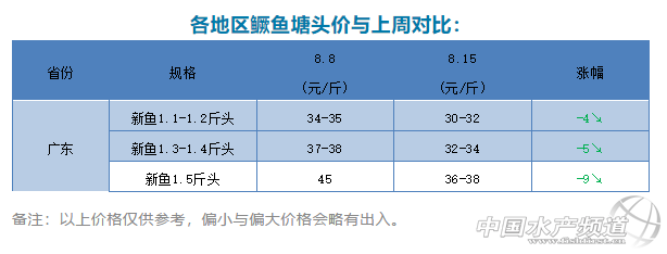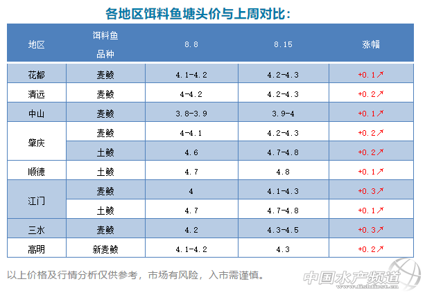 中國水產頻道原創報道, 鱖魚價格瞬間跌落神壇,近期是否能止跌回升? 文/圖鱖鱸前沿李靜 目前鱖魚老魚幾乎沒有了,新魚1.1-1.2斤頭價格繼上周暴跌8元/斤之后本周再次暴跌了4元/斤左右,新魚1.5斤頭更是暴跌了9元/斤,一鱖魚養殖戶說到:“鱖魚價格一夜之間跌落神壇”。 今天鱖魚塘頭價格約30-33元/斤左右,偏大魚頭(1.5斤魚頭或以上)36元/斤左右,但非常少。據廣東一流通商表示,鱖魚價格最近跌得有點猛,很多人不敢抓魚,但明天開始流通商訂魚數量可能會增多,鱖魚價格有望小幅回升。 也有流通商表示,魚還沒有養大的養殖戶不必心急,安心把魚養大,偏小的魚現在既沒有價格又沒有好產量,不要看行情不好急于出魚反而容易造成魚價持續低迷。 鱖魚苗:今年外省投苗量比往年明顯增多,當下大規格苗比較緊缺,7公分以上漲到了0.14-0.16元/公分。 餌料魚:市場需求量大,繼上周上漲了0.3-0.5元/斤之后,本周繼續上漲了0.1-0.3元/斤。 【關鍵字】:鱖魚 塘頭價格 水產養殖 |