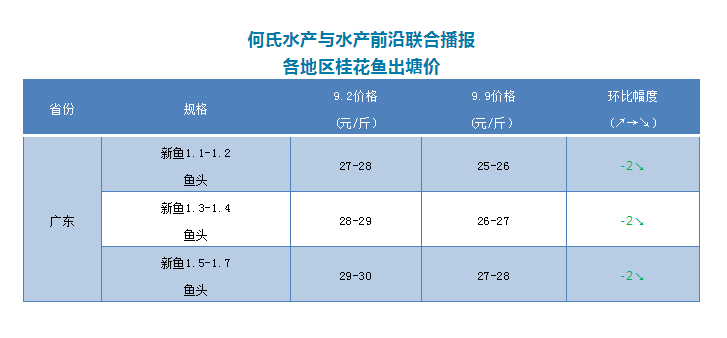 | 中國水產頻道原創報道, 文/圖 何氏水產、水產前沿 李靜 桂花魚 廣東桂魚新魚價格與上周相比持續下跌了2元/斤,現在1.1-1.2斤魚頭訂25-26元/斤,1.3-1.4斤左右魚頭訂26-27元/斤,1.5-1.7斤魚頭訂27-28元/斤,最大魚頭1.8斤左右最高訂28元/斤,實際成交價看魚頭大小及1斤以上比例來定。現在桂魚規格越來越大了,以1.3-1.4斤魚頭為主,個別1.7-1.8斤。本周上中秋節的量,預計銷量會上漲30%左右,現在收購商都在備貨中,新魚存塘量很多,收購商比較少開魚頭偏小的魚。由于外省新魚開始陸續上市,還有一部分病魚,所以外省出塘價格也在下跌。這幾周桂魚價格都在持續下跌,上周開始跌幅放緩,市場銷量不多,進凍庫的魚增多,因為凍庫價格比較可觀。預計本周銷量增加,節前會有2-3天的好行情,開塘價暫時變化不大。 |
