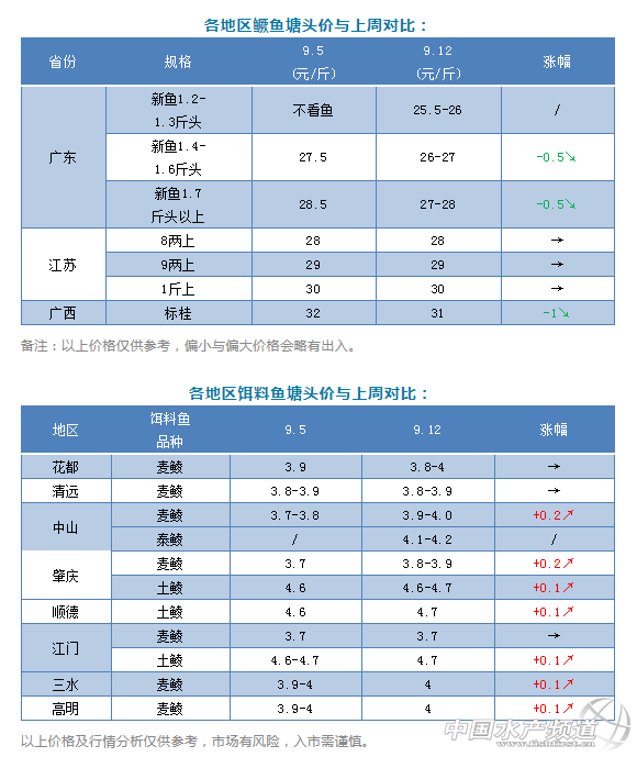 | 中國水產頻道原創報道, 文/圖 鱖鱸前沿 李靜 本周一,曾有媒體報道稱廣東鱖魚價格漲到30元/斤,鱖鱸前沿經多方核實后證實,本周廣東鱖魚規格最好的塘頭訂魚價格在28元/斤左右,部分產區有個別中桂成數高的訂28.5元/斤,大部分魚訂價在27元/斤左右。與上周同期對比,本周鱖魚價格不僅沒有上漲,還跌了0.5元/斤左右。但是受中秋節影響,銷量增長確實比較明顯,流通量加大。 除了廣東,本周廣西標桂也跌了1元/斤。江蘇鱖魚價格與上周持平,9兩上29元/斤,病魚依然很多,好魚價格上漲乏力。 今年9月份的鱖魚價格比去年同期低4-5元/斤,今天賣魚的江門某養殖戶表示,今年他養的鱖魚不僅沒錢賺,還要虧本。他今天賣了兩萬多斤魚,平均5.4斤餌料魚長一斤魚,餌料魚均價4.3元/斤,算下來是虧錢的。 餌料魚:本周餌料魚貨源充足,價格穩中有升,個別地區漲了0.1-0.2元/斤。 |