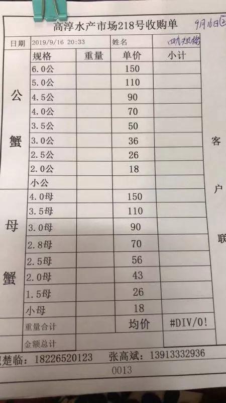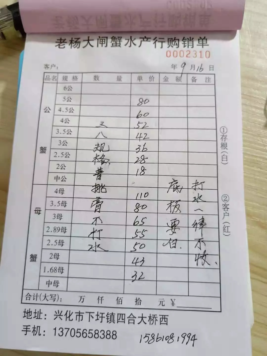 | 中國水產(chǎn)頻道原創(chuàng)報道, 做國內(nèi)最中立的報價平臺,不被利益綁架,讓養(yǎng)殖者、流通商、零售商與消費者都能第一時間了解最真實的價格與供求數(shù)據(jù)。 行情分析 與昨天相比,興化蟹價今天繼續(xù)下跌。大規(guī)格大跌,小規(guī)格小跌。4.5公、3.5母及以上大規(guī)格均跌10元/斤,其他規(guī)格跌1-7元/斤不等。3.5公跌從28元/斤跌至21元/斤,2.5母從43元/斤跌至28元/斤。 高淳今天也繼續(xù)下跌,部分門市一天報價2次,跌價2次,所有規(guī)格無一幸免,跌幅在4-20元/斤。4母從160元/斤跌至140元/斤,2.5母跌4元/斤,4.5公跌10元/斤。 今日交易價 馬鞍山 此報價由江蘇好潤塘南店張悅提供 泗洪 此報價由江蘇好潤臨淮店賈明先提供 今日參考價 興化 此報價由興化丁老板提供 此報價由江蘇好潤下圩店張玉蘭提供 高淳 此報價由江蘇好潤固城湖店劉坤提供 此報價由江蘇好潤獅樹店田玲提供 盤錦 此報價由盤錦王老板提供 泗洪 此報價由泗洪孫老板提供 此報價由江蘇好潤臨淮店賈明先提供 建湖 此報價由江蘇好潤馬家蕩店宋利坤提供 上海 此報價由上海曹老板提供 無錫 此報價由無錫王老板提供 |