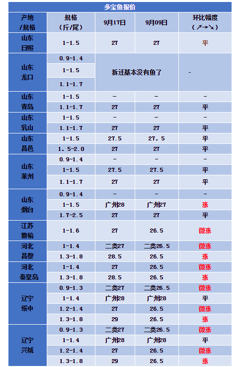 本周多地魚價呈現上漲趨勢,有養殖戶表示中秋期間魚需求量大,價格就漲起來了,其中河北、遼寧等地最高漲了2.5元,超標魚走俏,價格上漲至29元!近期山東地區魚價較為平穩,據了解目前存魚量有限,很多養殖戶惜售,想等到國慶節漲價再出魚,因此業內人士預計9月后期多寶魚價格上漲空間較大。而且流通商表示,受葫蘆島魚價上漲也會帶動價格上漲,但存塘有風險,建議養殖戶合理出魚。