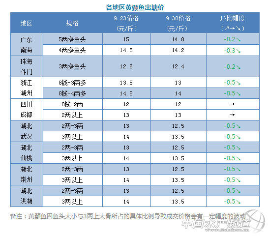 | 中國水產(chǎn)頻道原創(chuàng)報道, 文/圖 何氏水產(chǎn)、水產(chǎn)前沿 李靜 黃顙魚 1、廣東黃顙魚價格總體比上周跌了0.2-0.3元/斤,5兩多魚頭14.8元/斤,4兩多魚頭還是14.2元/斤,3兩多魚頭還是12.4元/斤,個別塘頭價格會有0.1-0.2元/斤的微調(diào),F(xiàn)在黃顙魚老魚存塘量接近尾聲了,新魚魚頭大部分在4兩多一點(diǎn),個別有5兩的,市場需求大魚較多,所以大魚頭價格最好。今天雖然是上國慶節(jié)的量,但銷量卻沒有明顯好轉(zhuǎn)。 2、本周浙江湖州黃顙魚價格下跌了0.5元/斤,銷量比上周大一些,3兩多魚頭價格在13元/斤,4兩多魚頭價格在14元/斤。由于廣東魚大魚頭不多,部分城市從浙江湖州拉魚,銷量比上周上升。 3、本周四川成都2兩以上和3兩以上黃顙魚價格與上周一樣,分別是12元/斤和13元/斤,當(dāng)?shù)劁N量還是不大,主要是本地銷售為主。 4、本周湖北各地區(qū)黃顙魚價格下跌了0.5元/斤,銷量比上周多。 |