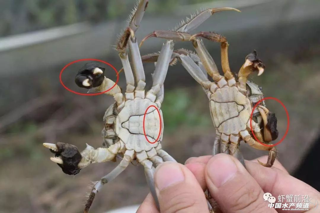 | 中國水產頻道原創報道, 老頭蟹一般個體較小,且不再生長,不能作為扣蟹購買,不宜繼續養殖 文/蝦蟹前沿 沈君 圖/浙江澳凌水產種業科技有限公司 蘇念 一般而言,長江流域的河蟹壽命為2年,第一年生長成為幼蟹(扣蟹),第二年達到性成熟,成為成蟹。而有些河蟹因為各種原因,第一年就性成熟,即1齡早熟蟹,俗稱“老頭蟹”。 老頭蟹一般個體較小,且不再生長,商品價值、成活率均不高,不能作為扣蟹購買,不宜繼續養殖。因此,如何辨別區分老頭蟹,對部分成蟹養殖戶特別是新手來說,就顯得尤為重要了。總體而言,老頭蟹腿毛粗硬,顏色較深;而扣蟹體薄,殼色發青黃。 早熟雌蟹比較容易區分,其腹部已成團臍(腹臍蓋滿),臍邊長滿細毛。而正常雌性扣蟹腹臍呈寶塔型,無細毛。 雌蟹辨別(左為老頭蟹) 早熟雄蟹螯足長滿絨毛,步足剛毛稠密。交接器變成堅硬的管狀體,腹臍會有較為明顯的突起。而正常雄性扣蟹步足剛毛稀疏,交接器粗短,腹臍平整。 雄蟹辨別(左為老頭蟹) |