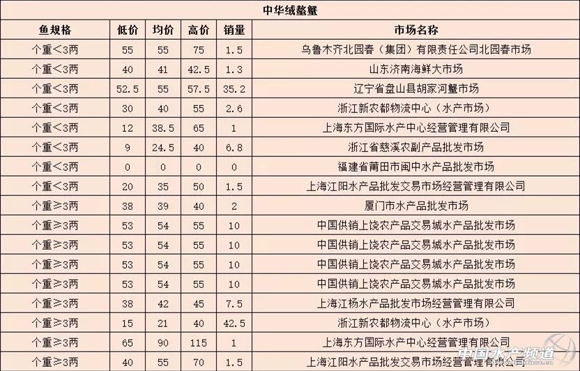 摘要: 中國水產(chǎn)頻道報道,10月24日最新中華絨螯蟹全國各地批發(fā)市場價。