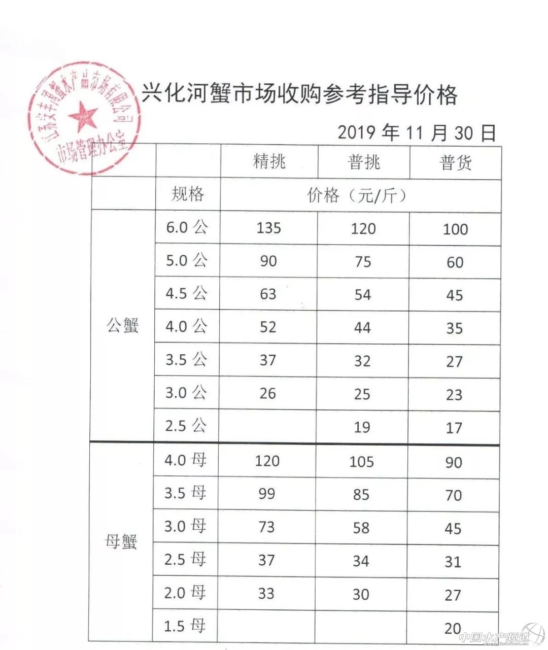 | 中國水產頻道原創報道, 蝦蟹行情每日播報 您身邊的行情顧問 歡迎關注蝦蟹前沿公眾號! 最新河蟹行情解析 高淳 近期高淳精品蟹價波動較為明顯,自1日上漲后,近兩天蟹價均保持平穩,目前平均蟹價為47.3元/斤。與去年同期相比,目前蟹價仍舊偏低。今天高淳精品門市各規格蟹價基本未變。 興化 近期興化精挑蟹價呈上漲趨勢,繼11月30日小幅上漲后,目前精挑蟹價保持平穩,今天各規格蟹價基本未變。 同時,今天興化市場指導價普挑、普貨價格均保持平穩。 今日河蟹參考價 興化 此報價來自江蘇安豐國蟹水產品市場 此報價由江蘇好潤馬家蕩店宋利坤提供 高淳 泗洪 此報價由泗洪孫老板提供 無錫 此報價由無錫王老板提供 宣城 |
