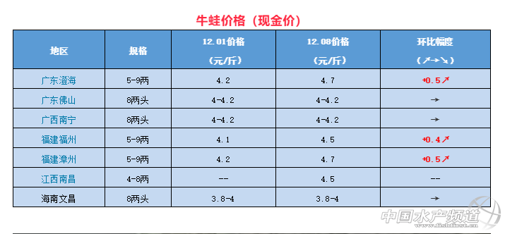 | 中國水產頻道原創報道, 本周牛蛙、泰蛙、青蛙最新行情報價 文/ 水產前沿 陳曉慶 一周行情簡析 牛蛙 福建、廣東澄海地區蛙價從前天開始出現大漲。今日澄海大蛙報價4.7元/斤,福建漳州5-9兩收4.7元/斤,相比上周上漲了0.5元/斤。福建福州5-9的大蛙今日現金4.1元/斤,欠帳4.5元/斤,相比上周上漲了0.4元/斤。江西南昌4-8兩的蛙報價4.5元/斤。廣東佛山、廣西南寧8兩頭牛蛙價格4-4.2元/斤,海南文昌8兩頭3.8-4元/斤,價格穩定,與上周持平。 隨著近期氣溫的大幅度下降,蛙價開始出現上漲的趨勢。廣東澄海目前的牛蛙存塘量較大,但還沒開始大量上市,出蛙的人并不多見,多數養殖戶還是選擇繼續等價。而周邊的梅州、河源和海陸豐等地經過前段時間的消化,目前存塘量較少。 福建由于蛙源較少,蛙價從前天開始大幅度上漲,福建漳州3-7兩的蛙開到4.2-4.3元/斤,5-9兩最多開到4.7元/斤。江西地區的流通商也表示目前本地收蛙比較困難。 廣西地區當前牛蛙存量依然較多,價格平穩,未能見到上漲的趨勢。部分地區受缺水干旱的影響,即使目前處于低價,也只能忍痛出售,避免進一步的損失。 泰國虎紋蛙 近期泰蛙價格較為穩定,供求關系趨于平衡。泰蛙6兩頭規格廣西南寧報價4.8至5元/斤,廣東佛山4.6至4.7元/斤,海南文昌4.5-4.6元/斤,價格相比上周有所下滑。 青蛙(黑斑蛙) |