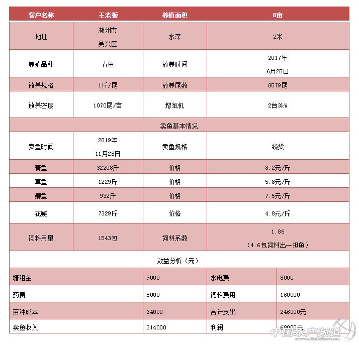 | 中國水產頻道原創報道, 今年魚價暴跌養殖虧大本?8畝的魚塘主養青魚利潤近7萬元,怎么做到? 文/圖 天邦食品股份有限公司 袁瀟 李逸群 青魚,四大家魚中的巨無霸,一直以來深受消費者的歡迎。據不完全統計,全中國青魚的總產量將近70萬噸。青魚作為重要的漁業資源存在于長江沿江湖泊和長江中下游,野生青魚通常棲息在水的中下層,生性不活潑。其主要的食物來源為螺螄、蚌、蜆、蛤等,偶爾也捕食蝦和昆蟲幼蟲。人工養殖青魚歷史也較為悠久,從最開始投喂螺絲到顆粒料再到膨化料,從池塘粗養到現在的精養,青魚養殖技術也在不斷成熟。 青魚 湖州作為青魚的產區之一,每年產青魚接近30000噸。然而由于青魚的習性,以及湖州獨特的氣候環境,一般精養池塘的青魚畝產量在2000-3000斤之間。然而我們故事的主人公王國峰今年卻養出了畝產超5200斤的成績,周邊的朋友為之驚嘆。 2019年11月28日,王老板其下8畝的魚塘,總計出青魚32208斤,草魚1229斤,鯽魚932斤,花鰱7329斤。據了解,該魚塘一共使用天邦全熟化淡水魚料1543包,飼料系數1.86(4.4包飼料出100斤魚),斤魚飼料成本低至4.7元,每畝魚塘出魚超過5200斤,單是青魚的產量超過4000斤/畝,一年的辛苦付出得到了回報。養殖具體數據如下表所示。 圖左一:天邦食品股份寧波分公司總經理助理 劉培,圖右一:湖州裕源農業有限公司董事長 王老板 王老板養殖青魚多年,幾乎年年都賺錢。對此王老板說道:“這些年魚價有高就有低,好的行情下賺錢容易,但是要想在行情不好的年份也賺到錢,最關鍵的是加強管理,真正把養殖成本降下來,才能在行情起伏中立于不敗之地。”關于如何降低養殖成本,王老板也總結了自己的一些經驗。 1、要注重投喂管理 根王老板介紹,今年青魚發病特別嚴重,他認為與養殖前期部分人家不控料有關。梅雨季節以前需要控制青魚的喂食量,準確投喂,有利于降低青魚腸炎發病率,以及維持前期水質穩定。發病率低了,減少飼料浪費,自然而然養殖成本就低了。 2、注重池塘底質管理,經常改底 青魚屬于底層魚類,池塘底質好壞,直接影響到青魚的健康。養殖過程中,池底猶如一個大型的垃圾回收廠,承載著水體與養殖動物產生的“垃圾”,死亡藻類、浮游動物、野雜魚等尸體,水殘餌、糞便,及藥物殘渣、外源水的有機物、泥土雜質等等,時間一長導致底質惡化、發黑、發臭。王老板經常使用一些底改產品,能夠分解池塘底部一些有害物質,為青魚提供好的底質環境,魚生活環境改善,才能養出高產。 3、選擇優質飼料,合理投喂 |