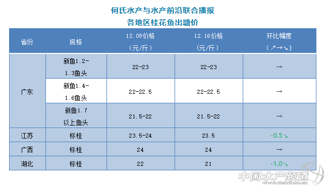 | 中國(guó)水產(chǎn)頻道原創(chuàng)報(bào)道, 文/圖 何氏水產(chǎn)、水產(chǎn)前沿 李靜 桂花魚 廣東桂魚一周持穩(wěn),塘頭1.2-1.3斤魚頭開(kāi)塘價(jià)22-23元/斤,1.4-1.6斤左右魚頭訂魚價(jià)格是22-22.5元/斤,1.7斤魚頭訂魚價(jià)格是21.5-22元/斤。目前廣東桂魚存塘量較多,銷量較少,主要以大規(guī)格魚為主,另一方面蟹塘桂魚也還在出,兩方面影響導(dǎo)致廣東桂魚上漲空間不大,預(yù)測(cè)接下來(lái)價(jià)格將持續(xù)持穩(wěn)。 本周江蘇、湖北產(chǎn)區(qū)的標(biāo)桂價(jià)格分別下跌了0.5-1.0元/斤,主要是兩大產(chǎn)區(qū)的蟹塘桂魚大量上市,對(duì)當(dāng)?shù)毓痿~價(jià)格造成很大的沖擊,預(yù)測(cè)本月桂魚上漲空間不大,銷量跟上周也差不多。 |