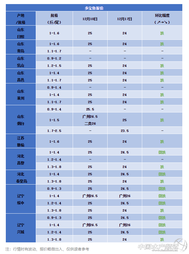 | 中國水產頻道原創報道, 多吃魚,《Nature》杰出論文指出魚更實惠,又營養,吃到魚價漲! 文 | 表 工業化水產圈 何鴻浩 本周價格 本周行情 近期國內豬肉價格在一陣下跌之后又迎來了上漲,主要上漲地區在華東、華北、東北等地。豬肉作為國民消費主要產品,在非瘟之后價格一路飛漲,雖然國家一直在投放儲備肉、調控價格,但受消費主導,價格始終是肉類贏家。《Nature》雜志今日公布了2019年度杰出論文,其中之一就指出吃“魚”解決微量營養素缺乏問題。人們從各種各樣的食物中獲得營養,但魚類可為人類提供豐富的微量營養素卻常常被忽視。作為食物來源,魚類來得更加實惠,且對環境影響較小,漁業營養與其他動物性營養供應是相當的,漁業應成為糧食和營養的核心組成部分。 這一文章被業內多家媒體轉發,引起養魚人的共鳴。但是魚類作為優質蛋白質來源,多品種魚類價格卻始終不能“揚眉吐氣”,不少養殖戶都表示要號召大家多吃魚,又實惠,又健康,希望魚價能被“吃”起來。 本周,多寶魚價格仍然是以下跌為主。據了解,東北地區存魚量較足,出魚量較多,但是魚車少,市場走量有限,讓該地區價格再跌1元/斤。而山東地區養殖戶也同樣表示近期需求太低,魚都走不動了。“擠壓的魚很多,尤其是超標魚,煙臺二斤上只有23.5元/斤。”一流通商表示。 另一遼寧地區流通商則認為今年情況并非“極度悲觀”,對比去年同期,今年超標魚和標魚價格都高出2-3元/斤,而且降溫后養殖較為順利,只要養出魚都能賺到錢。至于元旦能不能促進消費,帶動魚價上漲?業內人士則認為以目前的情況來看難以斷定,多品種魚類價格都在往下掉,多寶魚能不能逆勢而上,還是個未知數。 希望所有的多寶魚養殖戶加強溝通,讓信息更通暢一些,每個人都能賣出高價,好價! |