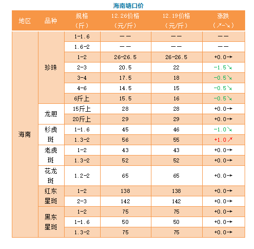 中國水產(chǎn)頻道原創(chuàng)報道, 12月26日海南、廣東、福建、北京石斑魚價格播報 文/水產(chǎn)前沿吳佳輝 行情簡析 海南:這段時間,石斑魚價格持續(xù)低迷,傳統(tǒng)節(jié)假日即將到來,是否有漲價的希望?業(yè)內(nèi)人士表示:由于存塘量還比較大,漲價的希望不高。 成品魚價格 石斑魚苗價格 石斑魚苗:本周海南幾乎沒有小苗,中苗價格也相差無幾。龍膽苗價格則較亂,所以本次周報不做報價。 特別感謝:海南晨海水產(chǎn)有限公司、海南大順發(fā)水產(chǎn)有限公司、萊州明波水產(chǎn)有限公司、廣東上上生物科技有限公司、廣東大順發(fā)水產(chǎn)有限公司、福建藝祺水產(chǎn)養(yǎng)殖有限公司、涌益水產(chǎn)專業(yè)合作社為本文提供價格! 【關(guān)鍵字】:石斑魚 價格行情 水產(chǎn)養(yǎng)殖 |