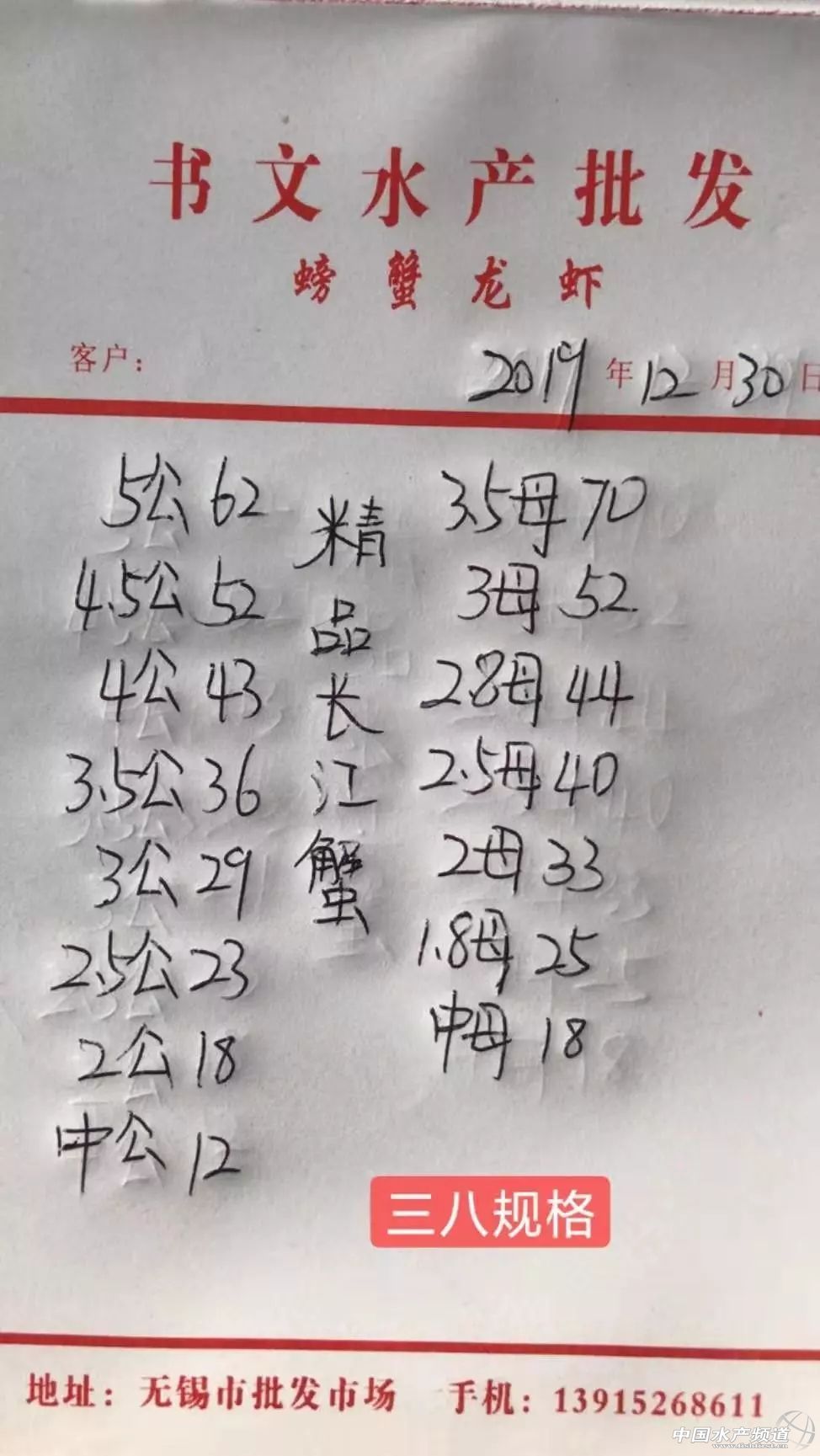 | 中國水產頻道原創報道, 扣蟹參考價 高淳 水陽 盤錦 成蟹行情解析 高淳 近期高淳精品蟹價整體呈上漲趨勢,今天蟹價略有下跌,其中3.5公、3公、2.8母、2母均跌1元/斤。其他各規格蟹價基本未變。與去年同期相比,目前蟹價明顯偏低。 興化 近期興化普蟹價整體先跌后漲,近四天蟹價保持平穩,今天各規格蟹價基本未變。 成蟹參考價 高淳 此報價由高淳倪老板提供 興化 此報價由興化丁老板提供 泗洪 此報價由泗洪孫老板提供 無錫 |