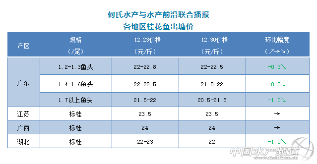 | 中國水產(chǎn)頻道原創(chuàng)報(bào)道, 文/圖 何氏水產(chǎn)、水產(chǎn)前沿 李靜 桂花魚 廣東桂魚持續(xù)下跌,塘頭報(bào)價(jià)1.2-1.3斤魚頭開塘價(jià)22-22.5元/斤,比上周下跌了0.3元/斤;1.4斤-1.6左右魚頭價(jià)格是21.5-22元/斤,比上周下跌了0.5元/斤;1.7斤魚頭訂魚價(jià)格是20.5-21.5元/斤,比上周也下跌了1.0元/斤。臨近元旦,這兩天整體走量加大,但價(jià)格不漲反降,主要原因是各地桂魚存塘量大,且元旦節(jié)日也只有一天,預(yù)計(jì)接下來價(jià)格上漲空間不大。 本周江蘇、廣西兩大產(chǎn)區(qū)的標(biāo)桂價(jià)格保持穩(wěn)定。湖北地區(qū)價(jià)格再跌1元/斤,受節(jié)日影響銷量有所上漲,銷售以本地供應(yīng)為主。 |