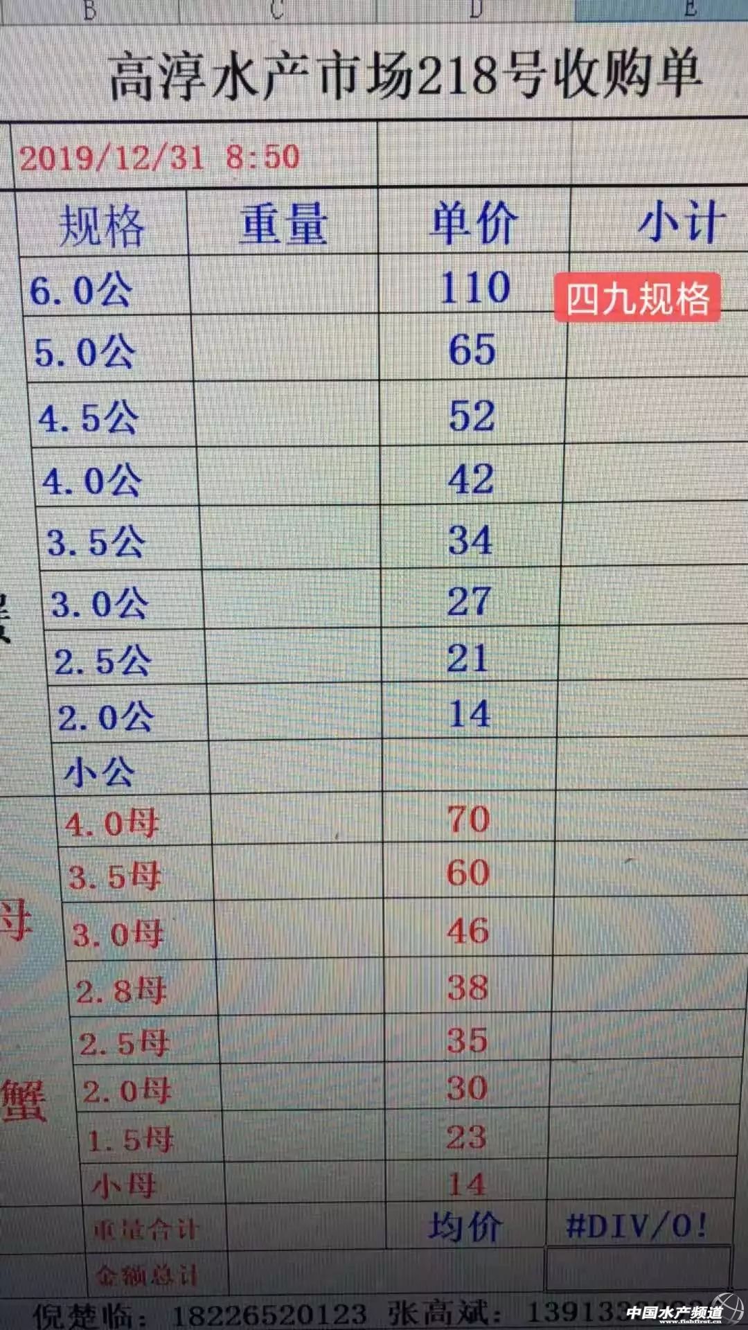 | 中國水產頻道報道, 扣蟹參考價 高淳 水陽 盤錦 成蟹行情解析 高淳 近期高淳精品蟹價略有波動,今天蟹價保持平穩,各規格蟹價基本未變,目前平均蟹價42.6元/斤。與去年同期相比,目前蟹價明顯偏低。 興化 近期興化普蟹價較為平穩,近五天蟹價保持平穩,今天各規格蟹價基本未變。 成蟹參考價 高淳 此報價由高淳倪老板提供 興化 此報價由興化丁老板提供 泗洪 此報價由泗洪孫老板提供 |