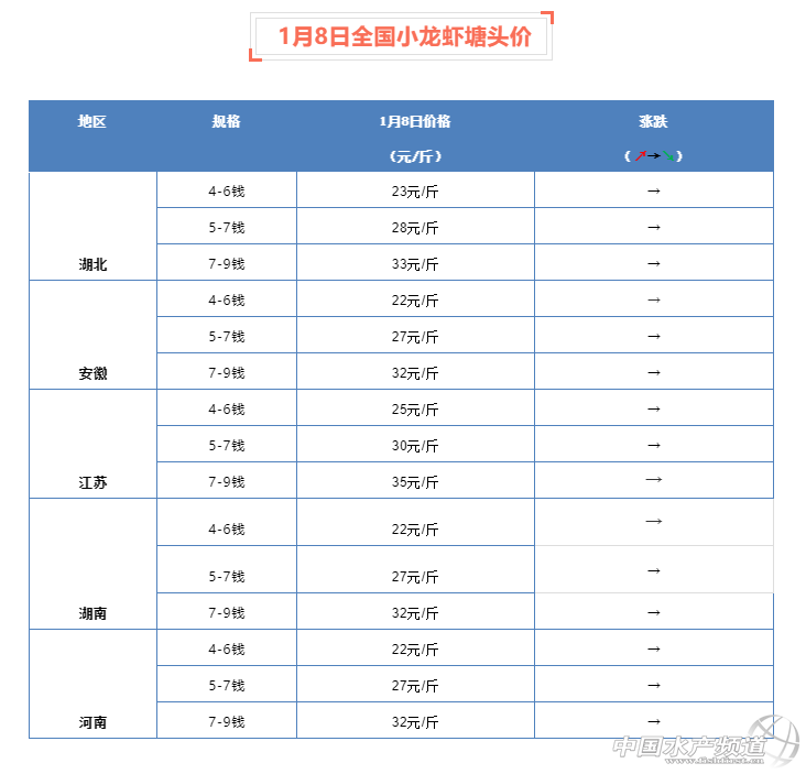 摘要: 中國水產頻道報道,1月8日全國小龍蝦塘頭價。