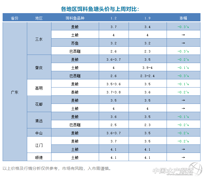 | 中國水產頻道原創報道, 文/圖 鱖鱸前沿 李靜 一周要聞 1月7日,佛山三水一養殖戶謝老板養的飼料鱖魚成功上市,據謝老板介紹,他是在池塘架設網箱養殖,當天出了3個箱共18000斤魚,還有一萬多斤留在塘里年后賣,當天出魚價格是22.5元/斤統貨,這批魚的養殖成本約15元/斤,平均有7.5元/斤的毛利潤。“今天的魚是給環球和黃沙的流通商,前些日子給他們免費贈送了兩百斤,讓他們的客戶都試嘗過,認可了才有今天22.5元/斤的賣價。” 謝老板還說,明年他有信心將飼料養殖鱖魚的成本降到12元/斤以下,2019年是他第一年養殖飼料鱖魚,雖然成功了,但離他想要的還差距太遠,他將繼續總結經驗,希望2020年能夠實現標準化、規模化養殖。”從種苗質量選擇、飼料選擇到養殖規模、設備、流通,要摸索出一套模式去做,才能把成本、風險控制在安全生產之中,看明年能否養出100萬斤吧!” 整體行情綜述 本周鱖魚行情持續爛市,全國最高又跌1.5元/斤,多地跌破成本價,部分養殖戶想趕在年前出魚,也有相當一部分養殖戶覺得價格太低想等年后賣,由于目前鱖魚存量較大,廣東、江蘇、湖北鱖魚存塘較大,且冷庫基本已經放假,預計年前上漲機會不大。 本周各地行情分析 廣東:今天最高開21元/斤,大部分魚訂價20-21元/斤,比上周同期又跌了1-1.5元/斤。由于目前行情較差,不少養殖戶觀望惜售計劃等年后再賣,有魚中表示年后鱖魚價格上漲的機會不大。 江蘇:江蘇今天統貨21元/斤,標桂23元/斤,比上周又跌了0.5元/斤,市場持續爛市。 湖北:本周價格保持穩定,銷量上漲乏力,養殖戶觀望心理較強。 其他地區:有廣東流通商進入廣西市場,廣西標桂(1-1.5斤)塘頭開24-24.5元/斤,價格幾乎全國最高,銷量不大。本周湖南、江西、安徽地區鱖魚價格也跌了0.5-1元/斤不等,山東鱖魚價格變化不大。 餌料魚:受鱖魚行情低迷影響,養殖戶投餌積極性差,本周餌料魚價格持續下跌,最高跌0.3元/斤。 |