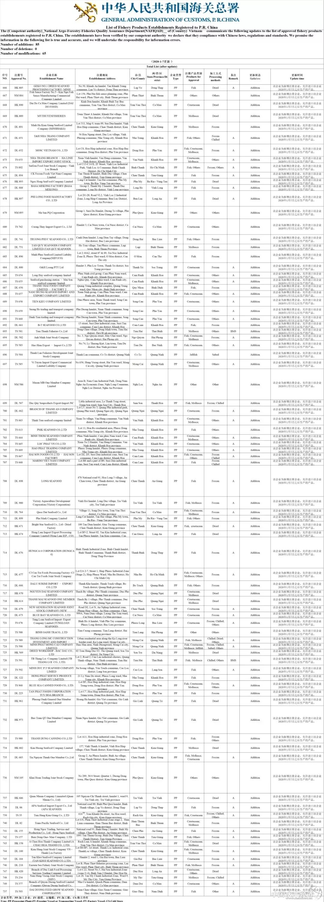中國水產頻道原創報道, 近日,海關總署更新越南對華出口企業名單。 文/ 海鮮指南(seafood-guide)編輯部 1月7日,海關總署網站更新,位于越南永隆市的BASA MEKONG FACTORY(東海旗下工廠,簡稱東海永隆工廠)正式獲得批準,自1月7日之后生產的巴沙魚產品均可向中國出口,廠號為DL888。 BASA MEKONG FACTORY是越南東海旗下三大工廠之一,位于越南永隆市,毗鄰芹苴。在2019年期間,因為資金問題,東海曾多次和中資企業溝通收購投資事宜。2019年下半年,越南航太入駐東海永隆工廠,將其每月巴沙魚加工量提升至40條標準貨柜。 有消息傳言,一位來自越南安江省有實力的巴沙魚養殖戶將會收購東海永隆工廠,但東海永隆工廠的出讓或投資消息到目前為止還沒有得到確認。 根據中國海關總署公布的文件顯示,此次共有85家越南海產企業獲得對華出口許可,皆為1月7日后可以向中國出口海鮮產品,還有多家越南企業變更了經營范圍或者企業名稱。 【關鍵字】:海關總署 東海永隆工廠 水產養殖 |