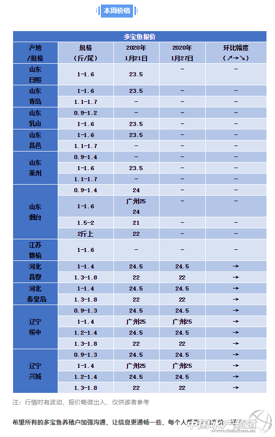 | 中國水產頻道原創報道, 一周多寶魚價格播報及行情解析 文 | 表 工業化水產圈 植銀素 本周行情 新型冠狀病毒肺炎“引發”水產品流通難題 據了解,隨著新型冠狀病毒全國大范圍發病,為了更有效的防控,不少地方采取了封城、封路的措施,當然對于類似非典病毒的同類病毒疫的防控起到了積極作用。但是,全面封城封村在一定程度上也造成物資供應受到了影響,水產養殖業亦是如此。近期山東地區多寶魚養殖戶表示本來是過年出魚最熱鬧的時候,但是已經沒有水車往來抓魚,陷入無人問津的窘境!不少抓了魚的水車又把魚退回來了,也沒有說什么時候恢復交易。對于仍有存魚的養殖戶而言,休市在一定程度上加大了養殖成本,現在兩天才喂一頓,希望能平安度過這次考驗! 呼吁交通“一斷三不斷” 交通運輸部副部長劉小明在新聞發布會上表示:個別地方為了保護社區或者某些區域,設置了一些硬性的隔離設施,我們非常理解。剛才李斌副主任也說了,社區特別是農村地區加強自身的防護非常重要,守土有責,我覺得這都是很好的措施。 但是從交通運輸來說,我覺得應該按照“一斷三不斷”的原則來推進工作:“一斷”是堅決阻斷病毒傳播渠道;“三不斷”,就是公路交通網絡不能斷,保證整個社會運行不能斷,應急運輸綠色通道不能斷,必要的群眾生產生活物資的運輸通道不能斷。 春節期間各地酒店、餐飲店都暫且休業,消費者也較少外出消費,終端消費市場萎縮導致水產品交易量大減。不僅是水產品和海鮮,在疫情被控制之前,預計全國范圍內餐飲業都將受到較大影響。在此情況下,流通商和養殖戶應重新制定應對措施和方案。 呼吁所︈有畜︀牧、水產行業養殖人轉發起來! 農村道路一︊斷三不︊斷, 重要生︍產生活資料不能斷! 不能讓成雞、鴨、魚蝦出不去, 飼料,苗種進不︄來! 農民不易,關系到食︈品供︃應,物價穩︈定。 希︊望當地政府,各︍地行業協會, 主管部門,重視起來。 特殊時刻穩定大局也非常重要。 |
