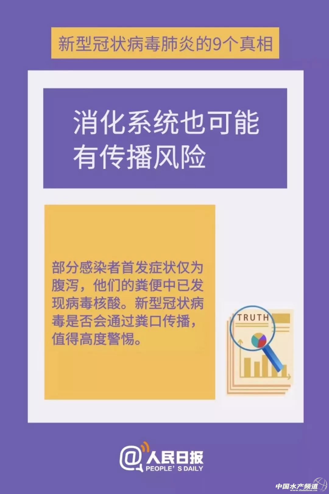 | 中國水產頻道原創報道, 新冠病毒或存糞口傳播風險,它不會感染魚類,但受污染的水可能感染人,為了自身與行業的安全,請高度重視! 文/ 水產前沿 賀志義 人民網:2月2日電(楊喬黃鈺席莉莉)據深圳衛健委官方微博,2月1日,深圳市第三人民醫院透露,該院肝病研究所研究發現,在某些新型冠狀病毒感染的肺炎確診患者的糞便中檢測出2019-nCoV核酸(新型冠狀病毒)陽性,很有可能提示糞便中有活病毒存在。 隨后在央視記者的采訪中,鐘南山院士表示:新型冠狀病毒有可能通過糞口傳播。現在這個問題應該非常重視,因為在糞便里已經發現病毒,糞便是否傳染病毒值得高度警惕。在有些地方,確實有使用便桶習慣,還放在魚塘里洗,確實要引起防控注意。 筆者認為站在水產從業者的角度來看,可以從以下三方面來分析問題。 01、什么是糞口傳播?如何自我防護? 糞口傳播也叫做經消化道傳播,一些傳染病的病原體(細菌、病毒、寄生蟲等)能夠在大便中存活,隨糞便排出體外后,污染了手、食物或者水源,又從口進入人體內,將疾病傳染給其他人。 做好下列個人防護措施: 1、不接觸野生禽畜排泄物,盡量少去活禽的市場。 2、不吃生食,器具要生熟分開并及時清洗; 3、食物禽肉蛋奶時,要充分煮熟; 4、瓜果蔬菜食用前,應充分清洗干凈; 5、不和疑似感染者共用餐具、水杯、牙刷等。 6、盡量喝開水,不喝生水。 7、及時用含氯漂白劑或其他有效消毒劑清洗消毒被患者嘔吐物或糞便污染的表面,立即脫掉和清洗被污染的衣物或床單等,清洗時應戴上橡膠或一次性手套,并在清洗后認真洗手。 02、新冠病毒在水里可以存活多久?是否可以通過水傳播? 1月28日,國家疾控中心主任,中國科學院高福院士在接受央視采訪時稱,新型冠狀病毒對體外環境適應性并不好,在空氣中不到半小時就死掉。 沒有找到新冠病毒在水里可以存活多久的科學研究數據,由于其結構與SARS病毒有一定的類似性((解放日報:與SARS-CoV的基因組序列相似度有79.5%)),所以以SARS病毒可以作為參考。一項來在2003年北京軍事醫學科學院微生物流行病研究所的論文,就對SARS病毒在外界物品中的生存和抵抗能力進行了研究,該研究表明,SARS病毒在自來水中,可以存活48小時以后,能夠從100萬滴度下降到1000左右,但仍然具有較高的傳播能力。 2020年2月1日,生態環境部辦公廳發布關于做好新型冠狀病毒感染的肺炎疫情醫療污水和城鎮污水監管工作的通知。 03、魚是否會感染新冠病毒? 答案是否定的,有專家證實水產動物不會感染新冠病毒,所以請大家放心吃魚! 復旦大學附屬華山醫院感染科主任張文宏在之前的采訪中講到:魚類里也有病毒,但到目前為止,較少有和魚相關的病毒感染人類。至少至今,我們還沒有發現冠狀病毒是來自魚類的,魚類和蝙蝠攜帶的基因雜交,那是需要想象力才能做到的事情,在科學界至今沒有發現過。(來源:解放日報) 此外,珠江水產所研究員林文輝老師也表示:到目前為止,未發現水產動物與人類有交叉感染的病毒病。 水產前沿媒體, 為水產品代言, 拒絕野味,多吃魚! |