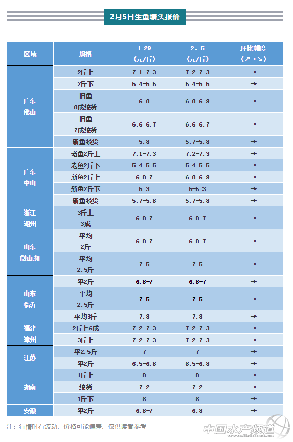 | 中國水產頻道原創報道, 新冠疫情肆虐,流通受阻,風波過后短期行情聽說能漲? 文/水產前沿 林貞武 最新報價、熱點行業資訊 生魚行情周報重磅來襲 每周相約水產前沿 受新冠疫情影響,據反饋目前很多道路都被封,魚車無法走動,病情暫無解除,多數人不敢隨意走動,市面上幾乎看不到出魚的塘。春節期間,受病毒影響,市場消費乏力,流通幾乎停滯,人工費對比平時翻了3倍,抓魚出魚積極性極低,僅少量出魚,并且皆以本地流通為主。當前酒席不準辦,聚會取消,名特優銷售受影響,有人擔心春季病害逐步來臨,如果疫情持續時間長,對價格影響會比較大。特別值得注意的是,即將進入陰雨、潮濕天氣,生魚爛身風險很高,需要做好預防工作,防住接下來的生魚“癌癥”。 受流通影響,市場較為平淡,各地魚價保持穩定,暫未有新的發價出,其他品種也是有相對平穩,黃顙魚繼續微張,加州、鱖魚上漲相對明顯。石斑魚、白蝦、海鱸、斑節對蝦、羅非魚、鯉魚等品種銷售受阻,出現降價的情況,而生魚這個品種,不管是新舊魚,按照目前的養殖成本以及市場發價來看,利潤不多,魚中暫時重新定魚的很少,暫時出的少量魚也是之前預定,在病毒的影響下,預計重新開定沒那么快,據魚販表示很多魚塘都推遲出魚了! 本周要聞 要聞1:生魚行情穩定,流通商幾乎停市,魚中停止定魚,多地路被封,在肺炎的籠罩下大家基本上都不敢出門,市場消費乏力,無外地魚車走動。運輸比較困難,有人擔心一旦開市,市場會混亂,魚市擁擠,加上春季到來,魚病嚴重,對魚價不是件好事情,也有人相對比較樂觀,看好短期內的后市,一旦解除疫情,消費量會迅速拉升,對短期價格會有所拉動。 要聞2:據了解,目前很多批發市場延遲開始,流通商、魚中暫時未有新的定魚計劃,僅定有少量10天后抓的魚,疫情未定,變數太大,目前熱情度很低。 要聞3:據實時監控了解,目前確診病例高達24388例,疑似23260,死亡492人,治愈944人,基本上村頭都已設置體溫檢測,大家盡量少出門,為人為己。 要聞4:順德作為廣東生魚產區的主要聚集地,為應對此次疫情,共同打贏疫情防疫狙擊戰,滿足順德市民使用口罩需求,順德即日起開放口罩預約登記平臺,廣大養殖戶可以通過“順德發布“、“順德市場監督”、“順德政務百事通”等公眾號預約登記,每人可憑借預約號到大參林門店免費領取2個。 2018-2020年行情走勢 2018-2020年廣東佛山2斤上舊魚價格走勢 一周行情分析 從以上曲線邊來看,2020年比2019年同期的價格起點要高一些,按照價格走勢來看,本來春節前后還是能夠有上漲的機會,但是碰上此次新冠疫情影響,大家伙幾乎不出門,消費受阻,出魚積極性極低,業界有人持消極態度,怕這段時間積極魚量較大,開始容易魚市擁堵,影響價格上漲,也有人認為本次病毒對水產養殖業來說利大于弊,市場對魚蛋白需求量增大,近期又爆出湖南禽流感事件,從長期的角度來看,特別是特種魚,機會還是非常大。 廣東佛山產區,本周價格基本維持穩定。目前廣東生魚產區據說是封了一半的路,目前有少量魚出,基本周本地,流通量很少。據了解近期以銷廣東本地、福建等短距離為主,基本沒有北車,以走老魚和大規格冬棚魚為主,新老魚價格基本沒什么差異了,當前出的魚為前段時間定的期魚,新定的塘很少,出魚積極性繼續走低,受本次傳染疾病影響,后市變得撲朔迷離。據了解,目前佛山新魚統貨價格為5.8元/斤,7成魚則可以達到6.1-6.2元/斤左右,舊魚8成上統貨在6.8元/斤之間,與上周持平,7成魚塘頭報價為6.6-6.7元/斤之間。 廣東中山本周價格穩定,2斤上冬棚新魚6.8-7元/斤,新魚2斤下5-5.3元/斤之間。舊魚2斤上7.2元/斤左右,2斤下5.4-5.5元/斤。暫時交易較少,病害影響大家不敢隨意出門,道路被封魚車無法走動。有人擔心要是本次病害延續時間過長,一旦結束后,價格不會太好,期待道路、市場盡快解封,目前局勢不容樂觀。即將進入陰雨、潮濕天氣,生魚爛身風險很高,若爆發爛身病,將會是雪上加霜 山東,本周行情穩定。目前首要影響因素就是新型冠狀病,加之受節日影響,近日山東截至至目前基本不出魚,據一養殖戶回饋,目前當地市場基本沒看到有出魚的,路全部封了,沒有人抓魚。目前價格仍為前段時間的價格,平均2斤的魚塘頭價為7.3元/斤左右,條形好的給到7.5元/斤,平均2.5斤的魚發價為7.5-7.6元/斤之間,平3斤的塘頭發價最高為7.8元/斤。本預測不出意外的話年初六左右將會進入新一輪的定魚潮,但是由于本次疫情影響,未來局勢仍較為迷茫,流通基本停止。 浙江湖州,本周出魚基本停止,行情保持穩定,3斤上3成價格仍然保持在6.8-7元/斤之間。湖南本周行情無顯著變化,2.5斤上的塘頭發價為8.2-8.5元/斤左右,統貨7.2元/斤,1斤下的價格為6元/斤左右。江蘇本周沒人出,行情穩定,本來以走湖北為主,受疫情影響,目前基本停滯,該地區目前平均2斤的塘頭價為6.5元/斤,平均2.5斤的塘頭發價為7元/斤,價格基本沒變化,市場運輸流通不便。 安徽蚌埠,本周行情比較穩定。疫情仍然較為嚴重,影響當地流通,出魚爆冷,目前價格不變,平均2斤塘頭價為6.8-7元/斤,平均2.5斤發價為7.2元/斤,平均3斤塘頭報價為7.5元/斤。原先年前大家都是想著春節漲價出魚,但是經歷此次病害之后,后市較為迷茫。 福建漳州,本周行情平穩。出魚量極少,暫時供應本地市場為主,該地區行情相對穩定。 新冠疫情繼續肆虐,暫時還未得到