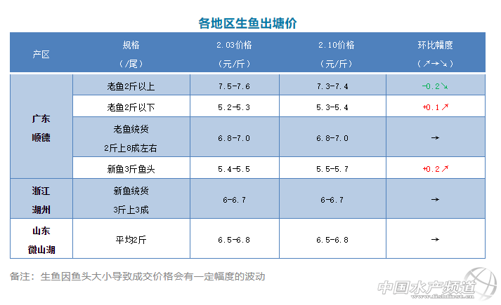 | 中國水產頻道原創報道, 生魚 1、本周生魚市場行情稍有改變,部分加工廠開始復工,偏小魚需求量上升,價格漲了0.1元/斤,但由于批發市場還沒有銷量,大魚銷量不大,老魚2斤以上價格下跌了0.2元/斤,只有7.3-7.4元/斤左右,2斤以上統貨價格跟上周差不多。目前存塘量還是老魚比較多,新魚存塘量也不少,偏小魚需求量增加,這幾天開新魚的收購商比上周多,現在新魚2斤以上5成左右的統貨價比上周上升了0.2元/斤,價格去到5.5-5.7元/斤,魚頭越大,價格越高。 2、浙江湖州、山東微山湖兩個主產區本周情況與上周差不多,銷量還是不多,價格與上周變化不大。 |