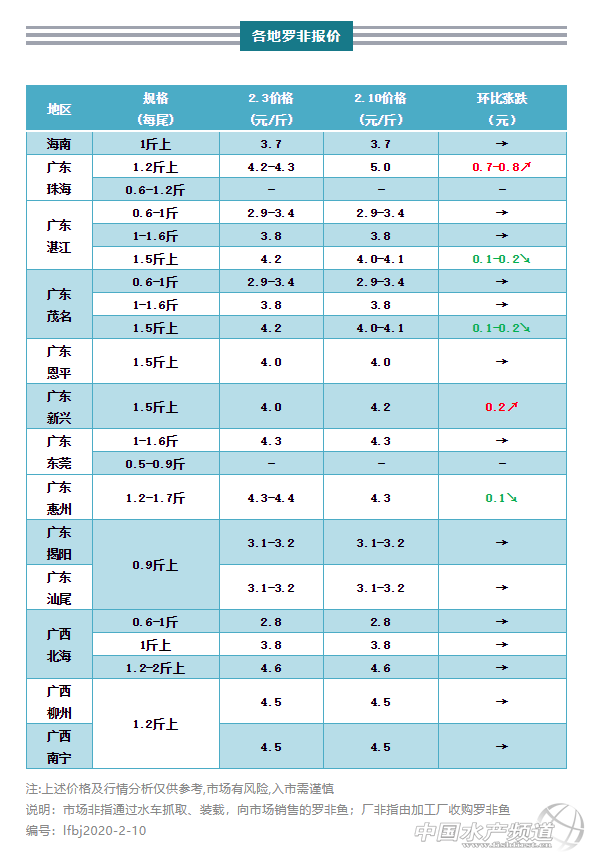 | 中國水產頻道原創報道, 現時養殖戶出魚意愿較大,只是擔心流通問題,正在觀望 文/ 水產前沿 葉豐齊 水產前沿專業為你推送羅非魚 最新價格行情及行業新聞、各類資訊。 同時歡迎行業人士踴躍爆料,請掃二維碼聯系 代表產區羅非魚行情走勢 一周要聞 我國羅非魚產業比較依賴加工出口,因為疫情的緣故,人員到崗率存在問題,現時許多加工企業仍未復工進行生產;某加工企業從業者回應筆者,在疫情解除前,羅非魚加工品出口可能會存在一些階段性影響,但長期來看影響應不會太大,因為過冬的羅非魚存量相對不會太多,疫情結束后國內市場能夠消化一部分,而目前供應國內的庫存已經比較少了,給復工后收魚留有一定的空間。至于養殖方面,有養殖戶表示,現時水溫低,基本投不上料,飼料暫時不成問題;去年年末也放足了冬苗,并不是很擔心疫情的影響;不過也有養殖戶提出,一旦魚塘出現點問題,如水質出現變化,受阻于鄉鎮封路與隔離措施,一時半會也沒法請來技術員幫忙,只能盡量多開增氧機了事;據悉,若天氣回暖,底肥有機質發酵分解耗氧厲害,魚塘易缺氧,養殖戶務必注意。 整體行情綜述 各產區羅非魚價格基本與上周持平,部分地區小跌,珠海大漲:海南繼續保持上周行情;珠三角地區,珠海1.2斤以上規格市場非較上周上漲0.7-0.8元/斤;恩平魚價與上周持平;新興1.5斤以上規格市場非較上周上調0.2元/斤;東莞魚價同上周一致;粵東地區惠州1.2-1.8斤規格市場非較上周下調0.1元/斤,至于揭陽和海豐魚價依然維持;粵西地區湛江和茂名廠非與上周行情持平,1.5斤以上規格市場非較上周下調0.1-0.2元/斤;廣西地區北海、南寧和柳州羅非行情保持不變。 各產地行情分析 海南地區:養殖戶在等待加工廠復工,本周沒有出廠非,0.6-1斤規格2.7元/斤,1斤以上規格3.7元/斤,行情皆保持不變;目前也沒有市場非出魚,塘頭現金收購價3.5元/斤,同上周;走海南西線市場1斤以上規格羅非3.5元/斤,與上周行情一致;據業者估計,依然約有30%的羅非存塘,而新苗投放量接近90%,后市行情以及今年整體形勢仍有待觀望。 珠三角地區:珠海存塘大約200萬斤羅非魚,包括平均5.5斤的大規格羅非(約8.5元/斤),本周有出1.2斤以上規格市場非,約5元/斤,環比上周上漲0.7-0.8元/斤;據了解,雖然價格喜人,但受疫情影響拉魚水車非常少,每周來拉個2-3回,每天最多能出1萬多斤,終端以珠海、中山附近市場為主;現時養殖戶出魚意愿較大,只是擔心流通問題,正在觀望,其中部分養殖戶已于年前投放新苗,但疫情后續影響依然未知;東莞1.2-2斤以上規格市場非4.3元/斤,同上周;有業者表示東莞和惠州的存塘量加起來大約有1000萬斤,疫情令流通受限,省外水車來不了,而現階段省內水車也較少,羅非出魚量非常少,主要都是珠三角周邊市場消費,并不是太好賣;特殊時期,恩平養殖戶基本不敢找水車來抓魚,1.5斤以上規格市場非約4元/斤,同上周;而加工廠仍未復工,1斤上廠非保持3.6元/斤;有養殖戶表示,現時水溫低,基本投不上料,飼料暫時不成問題;去年年末也放足了冬苗,并不是很擔心疫情的影響;不過也有養殖戶提出,一旦魚塘出現點問題,如水質出現變化,受阻于下鄉鎮封路與隔離措施,一時半會也沒法請來技術員幫忙,只能盡量多開增氧機了事;新興抓1.5斤以上市場非,到手價4.2元/斤,環比上周上調0.2元/斤;業者反映現時出魚都是走省內市場,佛山較多;當地出苗量暫時不多,但出苗前需要提前一天向水產監管部門報備獲得批準,而魚苗基本都是在高速服務站過車交接。 粵東地區:惠州1.2-1.8斤規格市場非4.3元/斤,環比上周下調0.1元/斤;據養殖戶反映有將近三分之二的水車回來抓魚,羅非好賣了一些;另有業者表示,作為養殖者最關心出魚順暢度和價格,目前還有部分地方封路,價格也未見上升跡象,慢慢恢復投料的他心里有點沒底;因福建凍廠方面還未復工,也沒出示確切消息,揭陽和汕尾完全沒有水車抓魚,9兩以上規格廠非保持3.1-3.2元/斤的價格,汕尾1斤以上規格市場非塘頭價4元/斤,揭陽同規格3.6元/斤,皆保持上周行情;有業者告知筆者,現在約有70%以上3-4兩的廠非存塘,受疫情影響,廠方復工后收購價可能不太理想,悲觀地表示1斤規格的廠非或許跌破3元/斤,實在不舍得賣。 粵西地區:湛江、茂名兩地市場非基本走不動,十分爛市,1.5斤以上規格4-4.1元/斤,環比上周下調0.1-0.2元/斤;廠方仍未有確切的復工時間公示,廠非收購價保持不變;0.6-1斤規格廠非塘頭價約2.9元/斤,最高3.4元/斤(5成3.4元/斤);1-1.6斤規格廠非約3.8元/斤(1.6斤以上魚超3成減0.1元/斤、超4成減0.2元/斤,以此類推)。 廣西地區:疫情限制了北海地區出魚,廠非0.6-1斤規格2.8元/斤,1斤上規格約3.8元/斤,1.2-2斤以上規格市場非拖網4.6元/斤,維持上周價格;南寧和柳州也沒有出魚,1.5斤左右規格市場非4.5元/斤,同上周價格。 |