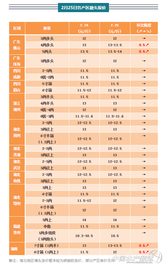 | 中國水產頻道原創報道, 預估疫情過后,水產量價齊齊上漲,水產類養殖品種銷量會翻倍 文/ 水產前沿 林貞武 最新報價、熱點行業資訊 黃顙魚行情周報正式發布 每周相約水產前沿 一周要聞 要聞1:目前黃顙魚主要為餐館消費,雖然大部分餐飲業還沒開業,黃顙魚的流通還是比較少。但是從市場反饋的信息來看,目前上漲格局已經明顯,從四川,到廣東,再到湖南已經陸續漲價,下一家是誰呢? 要聞2:湖北區域據政府部門初步估計得到3-4月份才正式解封,具體時間等通知,有人預估疫情過后,水產量價齊齊上漲,水產類養殖品種銷量會翻倍。 要聞3:武漢逐步恢復淡水產品供應,目前,武漢市農業農村局已成立水產保供小組,已經向社會發布淡水品供應信息。 要聞4:目前天氣基本上逐步回暖,特別是南方基本黃顙魚已經恢復吃料,雖然行情相高價運行,春季魚病也來襲,據了解很多養殖朋友當前熱情不高,想繼續搏一搏,對后市看好。 一周行情分析 2018-2020年湖北武漢3兩上黃顙魚成品魚價格走勢 本周黃顙魚總體銷售已經有了較大的好轉,流通量對比上周的去年同期的1/3-1/4之間增加許多。除湖北之外大部分產區已經陸陸續續開始出魚,在菜籃子工程的指導下運輸受阻逐步得到緩解,或許是市場對魚渴望的因素,魚價上漲勢頭猛烈。氣溫已經逐步有所回暖,魚開始開口進食,除湖北產區飼料供應有所影響,出門不便之外,其余產區投喂量有所恢復。據了解,隨著疫情慢慢平穩下來,當前很多地區在交通管控方面明顯改善,各地陸陸續續也開始復工,批發市場陸續開市。值得關注的是,近期廣東黃顙魚價格上漲勢頭高漲。 市場小范圍需求量繼續增加,價格上漲0.5元/斤。對照2018年、2019年、2020年這三年年初的行情趨勢,春節的魚價對比往年同期都要高,目前黃顙魚價格較年前已經呈上漲趨勢。市場解封,流通量增大,市場消費力增強,有人表示特種魚上漲趨勢即將大面積展開,黃顙魚是非常令人期待的。有一養殖戶近期剛塌定了兩塘魚,表示就算賠墊點定金也想繼續博一下后續的價格,看好后市行情,同時也是由于魚開始進食,經過越冬這么長時間,得讓它長長膘先。 廣東本周黃顙價格最高上漲0.5元/斤。廣東黃顙魚目前大規格較少,主要以3-4兩頭居多,行情繼續轉好,4-5兩頭的大規格暢銷,魚價較高,目前外省車日漸增多,市場上可見江蘇、江西、貴州、湖南、廣西等地魚車,流通逐步暢通。目前魚中定魚積極性大大增強,但是養殖戶賣魚積極性不高,據魚中表示比較看好黃顙魚接下來的行情,應該會是穩中上漲的趨勢。超3.5兩12塊/斤左右,3.3魚頭的黃顙魚塘頭價為11-11.5元/斤左右,4兩魚頭的塘頭發價為12快多,4兩多頭的塘頭價為13-13.5元/斤,5兩頭的價格為14元/斤,普遍漲價1-1.5元/斤。 當前珠海地區3兩多普遍為頭11元/斤左右,4兩頭塘頭發價12.5-13元/斤,4兩多頭為13-13.5元/斤左右。 四川本周價格和上周保持穩定。魚車可以進村了,村口不攔人,外面打魚隊進得去,據了解目前市場上到處可以抓魚,雖然說本周行情穩定,抓魚規格要求5寸上篩,但是總體來說價格又上漲的趨勢。當地近期的批發市場逐步開市,魚車走動逐漸頻繁,出魚的人也增多,雖然有些人在等魚長膘后再出,但是也有人擔心開春后魚容易生病,總體看來出魚趨于平穩。成都2-3兩的塘頭發價為11.5元/斤,眉山4.5寸篩的價格11-11.5元/斤,5寸篩發價11.5元/斤。 浙江湖州,本周價格跟以前差不多。前兩天當地出魚量不多,水車較少,目前很少沒開市。因為目前沒人知道啥時候完全解封道路,魚中定魚不多。目前3.5兩頭的魚塘頭發價為11.5元/斤,4.5兩頭為12.8-13元/斤,有人預測一旦解封,短期內魚價會有一定的機會,接下來的魚價可能影響會非常大。 湖北本周塘頭暫未恢復交易,市場沒有發價,暫時還是前段時間的行情。據了解目前基本都不能出門,出行管制嚴格,市場上暫時沒有動靜,稍微嚴重的地方,要是亂跑的話就得抓去集中學習,安全最重要,政府部門初步估計得到3-4月份才正式解封,具體時間等通知。批發市場上現在也沒有流通批發,市面上看不到有魚賣,居民生活物資基本由社區統一供應。春季到來,暫時水溫不高,魚暫時可以不吃料,需要注意的是寄生蟲等病害即將到來,魚藥很難買到,這對養殖戶來說是一大挑戰。武漢產區目前3兩上的魚塘頭報價為13元/斤,各地方2-3兩的魚價格本周為12元/斤,3兩上的魚報價為13元/斤之間,甚至大一些的可以為13.5元/斤。業界人士表示雖然今年的部分生產計劃有所影響,但是基本上到本月底應該是有機會恢復的,疫情過后,水產量價齊齊上漲,水產類養殖品種銷量會翻倍。 湖南價格上漲0.5元/斤。近期養殖市場逐漸恢復交易,現在開始有中轉站,價格有明顯的回升。目前主要還是以本地魚為主,外地魚比較少,有少量下廣東抓。總體來說當前想出魚的養殖戶朋友并不多,對后市還是比較樂觀,同時目前黃顙魚逐步攝食長膘,這也是養殖戶暫時不想出魚的原因之一,6寸篩的批發價為13.5-14元/斤,6寸篩規格塘頭報價為12元/斤,7寸篩13-13.5元/斤。 江蘇目前已經逐步恢復流通,開始抓魚,也有下廣東拉魚。福建漳州受市場流通影響,目前出魚的很少,流通量較少,中魚11.5元/斤,3兩上14元/斤。 |
