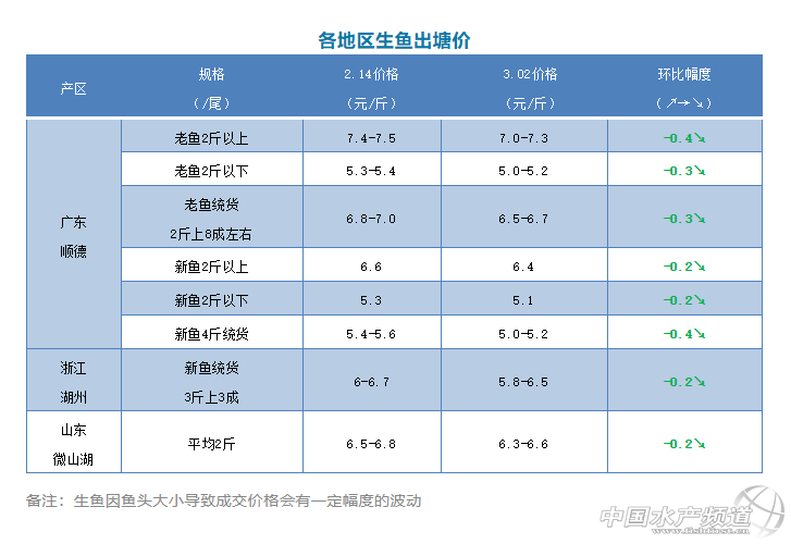 | 中國水產頻道原創報道, 文/圖 何氏水產、水產前沿 李靜 生魚 1、由于這段時間加工廠開工人手不足,開工量不大,很多農戶春節積壓了很多魚要出魚,市場銷量供大于求,價格下跌了。目前存塘老魚還有很多,新魚也不少,市場行情與上周情況差不多,沒有明顯的好轉,開工的收購商還是不多,由于大魚市場還沒有全面開通,大魚銷量沒有好轉,老魚開塘量還是不大。老魚2斤以上價格在7.0-7.3元/斤左右,比上周下跌了0.4元/斤。2斤以下是5.0-5.2元/斤,比上周下跌了0.3元/斤。2斤以上統貨價格6.5-6.7元/斤,比上周也下跌了0.3元/斤。新魚新魚2斤以上5成左右的統貨價與上周相比下降了0.2元/斤,5成2斤以上價格在5.2元/斤,6成2斤以上價格在5.4元/斤左右。目前生魚存塘量較大,預計價格或將持續下跌,銷量會慢慢上升。 2、浙江湖州、山東微山湖兩個主產區本周價格比上周也下跌了0.2元/斤,情況與上周差不多,銷量還是不多。 |