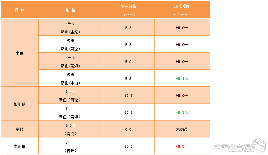 文/ 珠海海龍、水產前沿 吳佳輝 生魚 中國水產頻道原創報道,順德杏壇:舊魚7-8成左右統級5.7-6.0元。新魚大魚5-7成統級發價5.0-5.3元。本周走貨量有所增加,同時有爛身魚沖擊市場,總體供過于求,價錢仍然在低位徘徊。近期發現爛身魚塘增多,建議加強預防處理。 勒流區域:魚價有回升,市場走量加大。但總體待出售的魚存量大,短期難大反彈,建議根據自身情況考慮是否出魚。去年早批生魚近期開始散春,建議加強疾病預防處理。 南海西樵九江:南海九江范圍內爛身生魚繼續增多,接近30塘,影響好魚價格和出魚。目前舊魚7~8成大魚統級價格5.8~6.0元,新魚統級價格4.8~5.0元。 中山區域:本周魚價行情變化不大,舊魚8成左右大魚統貨5.8-6.2元,新魚6成左右統級5-5.3元。近期天氣變化雨水增多,諾卡氏發病和爛身等問題增多,建議養殖戶不要放松管理,加強預防處理。 |