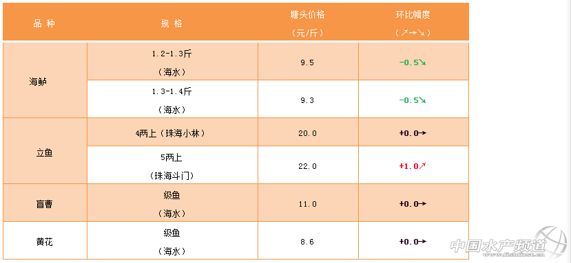 中國水產頻道原創報道,鱸魚:1.1斤以下:10元/斤;1.1-1.2斤:9.8元/斤。以上為水車價格。天氣波動大,以雨霧天氣為主,魚塘管理注重做好增氧、改底,預防游水。