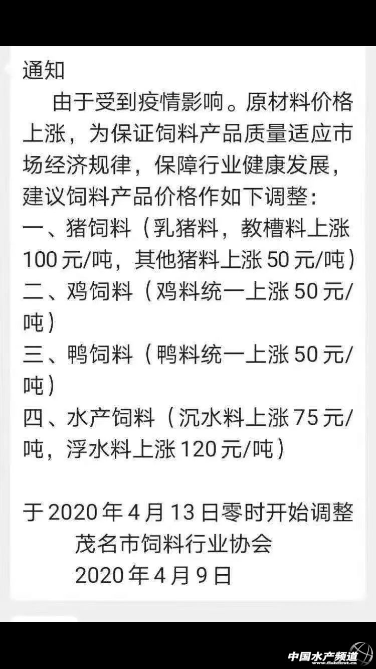 | 中國水產頻道原創報道, 豆粕、魚粉價格創新高,廣東水產料全面漲價,最高漲200元/噸 據飼料行業信息網發布2020年4月13日國內飼料原料行情消息,主流市場豆粕再漲10元/噸,達到3030元/噸,超級蒸氣魚粉價格上漲了100-200元/噸,達13800-14000元/噸。 作為世界上最大的大豆進口國,行業專家預測,大豆的供給問題或是今年中國糧倉的一個“坎”,大豆壓榨后的豆粕是水產飼料尤其是普通水產料中的重要原料,近期豆粕的價格上漲了400元/噸左右。水產投苗養殖旺季即將來到,目前不少料企已感受到這一市場“沖擊”。4月9日,茂名市飼料協會就發出一份通知,通知稱,由于受到疫情影響,原材料價格上漲,為保證飼料產品質量適應市場經濟規律,保障行業健康發展,建議水產飼料的沉水料上漲75元/噸,浮水料上漲120元/噸。上漲時間為4月13日。 自茂名市飼料協會發布建議飼料上調消息以來,茂名大北農、中糧飼料、陽江昌農、茂南銀帆飼料、茂名中佳等宣布紛紛宣布漲價,其中沉水料約上漲75元/噸,浮水料約上漲120元/噸,特種魚料上漲160-200元/噸。具體如下: 茂名大北農農牧科技有限公司漲價通知 尊敬的事業伙伴: 因近期原料價格有所上漲,經公司會議研究決定于2020年4月13日00:00時起對公司產品價格進行如下調整, 魚料:魚料所有產品均上調120元/噸。感謝您對大北農事業的一貫支持與理解!謝謝! 茂名大北農農牧科技有限公司 中糧飼料(茂名)有限公司漲價通知 于受到疫情影響。原材料價格上漲,為保證飼料產品質量適應市場經濟規律,保障行業健康發展,我司飼料產品價格作如下調整: 水產飼料(沉水料上漲75元/噸,浮水料上漲120元/噸) 于2020年4月13日零時開始調整 中糧飼料(茂名)有限公司 2020年4月10日 茂名市中佳飼料有限公司漲價通知 尊敬的客戶: 首先感謝您對中佳飼料的信任與支持!由于原材料價格上漲,為適應市場經濟規律,公司決定從2020年4月13日零時起價格調整如下:0#魚料升2元/件,塘鲺料升4元/件,其他羅非及草魚料升3元/件。具體以銷售系統開單價為準。 歡迎繼續使用高品質的中佳飼料產品。謝謝! 茂名市中佳飼料有限公司 2020年4月12日 陽江昌農農牧科技有限公司漲價通知 尊敬的事業伙伴:因近期原料價格有所上漲,經公司會議研究決定于2020年4月13日00:00時起對公司產品價格進行如下調整, 魚料:魚料所有產品均上調120元/噸。 (注:其中老客戶按3月份提貨量的30%不漲價,需4月27號前提完,逾期將按新價格執行)敬請知悉!感謝您對大北農事業的一貫支持與理解!謝謝! 陽江昌農農牧科技有限公司 茂名市茂南銀帆有限公司漲價通知 由于受到疫情影響。原材料價格大幅上漲,為保證飼料產品質量,現飼料產品價格作如下調整: 水產飼料(1.沉水料上漲75元/噸。2.浮水料上漲120元/噸。3.特種魚料上漲160元/噸)。 于2020年4月13日零時開始調整。 特此通知 茂名市茂南銀帆飼料有限公司 2020年4月11日 茂名市新輝飼料有限公司漲價通知 由于受到疫情影響。原材料價格上漲,為保證飼料產品質量適應市場經濟規律,飼料產品價格作如下調整: 水產飼料(沉水料上漲75元/噸,浮水料上漲120元/噸,特種魚料上漲200元/噸) 于2020年4月13日零時開始調整。 茂名市新輝飼料有限公司 2020年4月11日 茂名市飼料協會建議飼料漲價通知 |