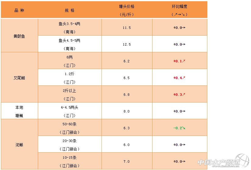文/ 珠海海龍、水產(chǎn)前沿 何鴻浩 中國水產(chǎn)頻道原創(chuàng)報道,南海區(qū)域黃顙魚:本周價格保持穩(wěn)定,單性與雜交黃顙相差1元左右,5兩多頭的雜交黃顙魚價格可以發(fā)到13元/斤左右,但具體價格還是要看大魚成數(shù) |