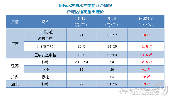 | 中國水產頻道原創報道, 文/圖何氏水產、水產前沿李靜 桂花魚 本周鱖魚塘頭一天一個價格,漲勢驚人。1-2成小魚沒有中桂開塘價26-27元/斤,比上周上漲了6元/斤;1-2成中桂開塘價24-25元/斤,比上周上漲了4.5元/斤;三成以上中桂價格是22-23元/斤,比上周也上漲了3.5元/斤。目前廣東鱖魚存塘量還是比較多的,但是大多養戶賣跌不賣漲,出魚積極性較低。前段時間流通商訂的魚,價格一開始升,部分養戶就撻了定,導致市場缺魚,搶魚搶高了價格。預計接下來價格或許還有小幅上漲。 除廣東外,江蘇地區的標桂價格也上漲了2.5元/斤,報價是26元/斤;中桂價格比上周也上漲了1元/斤,報價是20元/斤。湖北桂魚價格本周上漲了3元/斤,標桂價格是24-25元/斤。廣西標桂本周價格也上漲了2元/斤,報價24元/斤。 |