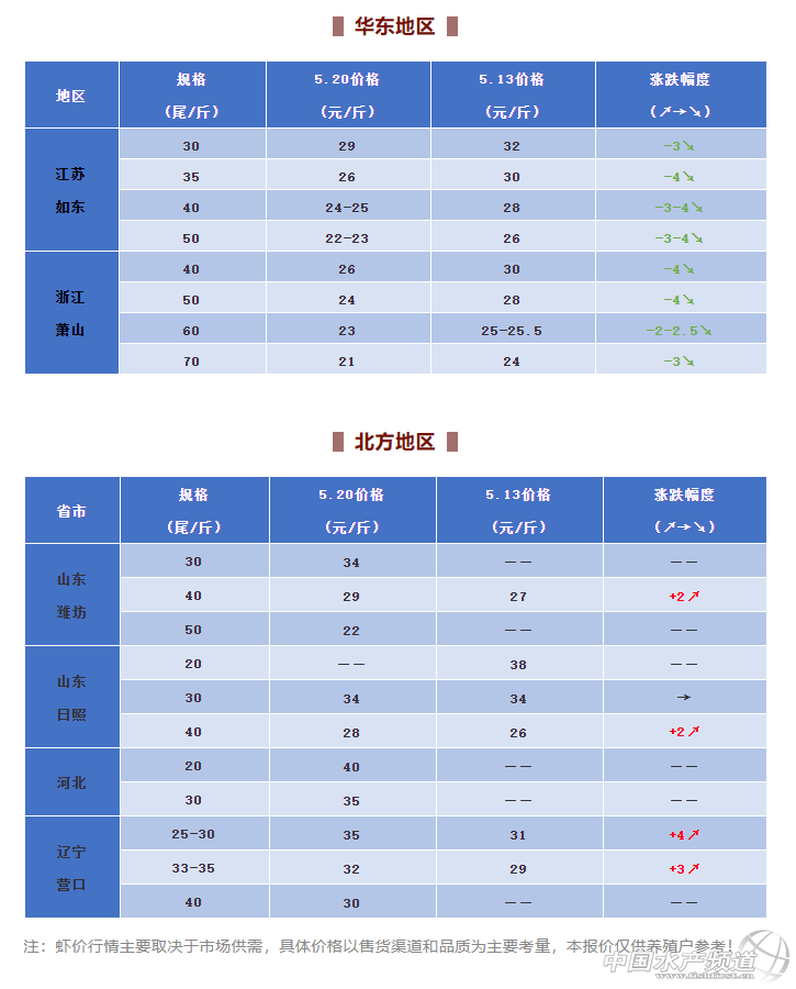 | 中國水產(chǎn)頻道原創(chuàng)報道, 蝦價跌跌不休,養(yǎng)殖戶說“踩死不賣”?今年養(yǎng)蝦還能掙錢嗎? 文/水產(chǎn)前沿植銀素 本周要聞與行情總結(jié) 本周,華南市場白蝦價格持續(xù)下滑!據(jù)了解,珠三角對比上周同期下滑1-2元/斤,目前棚尾蝦基本清空,白水塘成品蝦逐漸上市了。“蝦難養(yǎng),頂不住就得出,一天跌價1元,天天不同價,但是同樣心塞啊!”中山地區(qū)養(yǎng)殖戶表示現(xiàn)在蝦子發(fā)病比較厲害,病蝦一多,對珠三角價格有較大沖擊。同樣跌價的還有陽江、湛江等粵西地區(qū),湛江養(yǎng)殖戶表示近兩天蝦掉價特別快,今年養(yǎng)蝦并不順利,如今蝦價不好,他氣氛又無奈表示“踩死不賣”!海南地區(qū)蝦價排到全國最末位置,40頭塘頭價只有17元左右,50頭不足15元/斤,有從業(yè)者說現(xiàn)在至多8成養(yǎng)殖戶已經(jīng)轉(zhuǎn)養(yǎng)斑節(jié)對蝦! “福建蝦價穩(wěn)中有降,目前可上市的大蝦較少,但是被迫上市的中小蝦較多,消費與供應(yīng)不匹配,跌價是必然的了。”漳州收購商總結(jié)近兩天的行情。目前福建存塘蝦逐漸豐足起來,供應(yīng)基本不成問題,但是同樣有大量庫存的江浙一帶,已經(jīng)是棚蝦收獲旺季。今年江浙棚蝦養(yǎng)殖較為順利,穩(wěn)產(chǎn)者居多,大量活蝦上市沖擊市場,寧波養(yǎng)殖戶表示對后市并不看好,“下午價格比早上又跌1-1.5元/斤!據(jù)我所知,還有好幾個幾千畝的大戶要準(zhǔn)備賣蝦了,估計價格還要再跌。”他說道。 廣西大蝦幾乎沒有,40頭報價25-26元/斤,還處于偏高位置。“現(xiàn)在有大蝦的都建議先出了,一是天氣熱,水車不好走,消耗特別大;另外,還有半個月土塘蝦就可能大量上市了,價格可能會跌!”當(dāng)?shù)貜臉I(yè)者說到。 各產(chǎn)區(qū)蝦價及分析 |