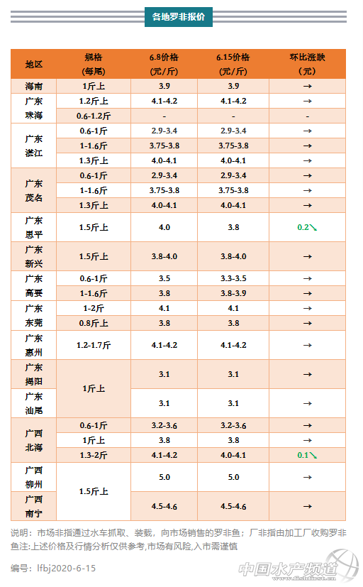 | 中國水產頻道原創報道, 經銷商在到處找0.6-1斤規格魚,若抓了這些規格,后面大魚又接不了 文/水產前沿葉豐齊 水產前沿專業為你推送羅非魚 最新價格行情及行業新聞、各類資訊。 同時歡迎行業人士踴躍爆料,請掃二維碼聯系 代表產區羅非魚行情走勢 整體行情綜述 本周各產區羅非魚行情基本平穩,個別地區價格稍稍下調;海南地區廠非和市場非皆保持上周價格;珠三角地區,珠海、新興、肇慶高要以及東莞羅非皆保持上周價格,而恩平1.5斤上市場非下調0.2元/斤;粵東地區惠州、揭陽和汕尾地區羅非及廠非價格皆不變;粵西地區湛江和茂名廠非0.6-1斤規格、1-1.6斤規格廠非以及1.3-1.5斤上規格市場非價格皆與上周持平;廣西地區北海0.6-1斤規格和1斤上規格廠非價格與上周一致,市場非價格則下調0.1元/斤,南寧和柳州1.5斤上市場非皆保持上周價格。 各產地行情分析 海南地區:0.6-1斤規格廠非2.9-3.5元/斤,1斤以上規格廠非3.9-4元/斤,同規格塘頭現金收購價3.7-3.75元/斤;近期高溫死魚加上干旱缺水,羅非規格魚存塘量減少,經銷商在到處找0.6-1斤規格魚,若抓了這些規格,后面大魚又接不了,目前整個海南廠非收購量大約在150萬-200萬斤之間,但基本上是收不夠量。 珠三角地區:珠海1.2斤以上規格市場非4.1-4.2元/斤,個別地區4.3元/斤,而5-9斤大羅非塘頭價7元/斤,同上周價格;東莞1.2-2斤以上規格水車走珠三角市場4.1元/斤,同上周價格,6兩上廠非3.5元/斤,而一周一次平均8千斤的外省車抓0.8斤上統貨3.8元/斤,暫同上周行情;恩平0.6斤上統級廠非3.2元/斤,同上周,1.5斤以上規格市場非3.8元/斤,環比上周下調0.2元/斤;新興1.5-1.8斤上規格到手價3.8-4元/斤,同上周價格;而肇慶高要0.6-1斤規格廠非3.3-3.5元/斤,而1-1.6斤規格3.8-3.9元/斤。 粵東地區:惠州1.2-2斤規格市場非4.1-4.2元/斤,同上周;外省水車抓1.1-1.2斤上規格3.8元/斤,環比上周下調0.2元/斤;養戶表示每天大概30輛車抓魚,流通量上沒有多大變化,但外省車拉得多一些;揭陽和汕尾1斤以上規格廠非(走汕尾本地凍廠)塘頭價3.1元/斤,同上周,1-1.2斤上規格市場非3.6-3.7元/斤,保持上周行情。 粵西地區:湛江、茂名兩地1.3斤以上規格市場非4.0-4.1元/斤,同上周價格; 加工廠收購底價大約在2.9-3元/斤之間,1斤以下成數每多1成增加0.1元/斤,最高可去到3.4元/斤(出魚量大的可以達到3.5元/斤),暫與上周持平; 1-1.6斤規格3.75-3.8元/斤,和上周行情一致;據悉也有廠以3.3統價收0.6斤上規格,但1.6斤上超出1成扣0.1元/斤,以此類推;另有一些廠超2成扣0.1元/斤,超3成拒收,有些則超3成扣0.1元/斤,超4成扣0.2元/斤; 另外,0.6-1.5斤統級有廠開出3.6元/斤的最高價,而飼料廠合同魚0.6-1斤規格3.1-3.6元/斤(按成數),1-3斤規格3.8元/斤,同規格外省車則多出0.1元/斤; 除了專收1-3斤統級的加工廠,2.2-3斤規格魚一般扣0.05元/斤,超3成扣0.1元/斤,5成扣0.2元/斤,7成扣0.3元/斤。 廣西地區:北海0.6-1斤規格廠非3.2元/斤,6成不過斤則3.6元/斤左右,最高去到3.75元/斤(按每車重量及當車比例),同上周價格;1斤上規格廠非3.8元/斤,同上周;而1.2-2.2斤統級4-4.1元/斤,環比上周皆下調0.1元/斤;業者表示高溫天氣養戶出魚積極,因為市場不走量,價格也沒有太大競爭力,能走廠的都走廠,起碼出魚批量較大;南寧1.5斤上規格羅非4.5-4.6元/斤,維持上周價格;柳州1.5-2斤規格5元/斤,暫時與上周行情一致。 |