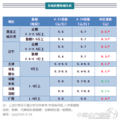 | 中國水產頻道原創報道, 新魚上市前行情或能保持穩定,甚至有一定上調空間,但建議養戶把握主動權盡早清塘 文/水產前沿葉豐齊 代表產區鯉魚行情走勢 整體行情綜述 本周多產區鯉魚行情回升,一地價格浮動;黑龍江和遼寧2.5斤以上規格全鱗鯉魚價格較上周皆上調0.2元/斤,同規格散鱗價格上調0.3元/斤;天津和唐山地區2斤上新魚較上周皆上調0.1元/斤;河南中牟和洛陽1.3斤上規格老口鯉魚價格皆浮動性下調0.1元/斤;廣西1.5斤上規格鯉魚上調0.4元/斤,2斤上規格上調0.3元/斤。 本周各地區鯉魚行情一覽 東北地區:黑龍江與遼寧2.5斤以上規格全鱗鯉魚塘頭價5.7元/斤,環比上周上調0.2元/斤;2.5斤以上規格散鱗鏡鯉塘頭價同是5.7元/斤,環比上周上調0.3元/斤。無論全鱗還是散鱗,兩地也有賣出5.9元/斤的高價。目前老口魚存塘量進一步減少,魚販已經不容易訂到規格魚,正在四處尋找,價格相應回升一些。不過,疫情影響尚未結束,北京周邊市場基本缺少銷量,有些次級市場還關門不讓賣,而能夠進行交易的淡水魚市場也要求出示產地證明以及檢驗合格證等,手續相對繁瑣,這對整體出魚量會有一定影響。另外,新魚將在半個月后批量上市,目前也有部分可出,但業者表示市場依然較偏好老口魚,在徹底清完前可能沒有魚販去動新魚;預計后市行情可在新魚集中上市前保持穩定,甚至還有一丁點上調空間。 河北唐山和天津地區:唐山和天津新魚1.6斤起規格塘頭價5.2元/斤,2斤上5.4-5.5元/斤,環比上周皆上調0.1元/斤。市場偏好后者,價格更高,養戶紛紛趕價賣,目前出魚量相對較大,同時養戶也傾向把2斤下的養到2斤上再上市。不過,有業者表示北京疫情管控對河北和天津鯉魚消費影響很大,目前周邊市場大部分走不了,而本地釣場需求有限,一般只能流向山東、河南、內蒙和山西,氣溫高水車也不多,較往年同期差不多下降了15-20%的流通量,后市行情仍有下滑的可能。 河南地區:1.5斤以上規格鄭州中牟塘頭價5.7-5.8元/斤,環比上周下調0.1元/斤,洛陽塘頭價同是5.7-5.8元/斤,環比上周下調0.1元/斤;本地大規格新苗要到8月份才上市,現在市場存魚特別少,就洛陽和商丘還有一點點,正處于青黃不接時期,本周價格雖略為浮動,但基本沒有太大變化,預計后市行情也能保持直至新魚批量出魚。 廣西地區:存塘規格多為1.5斤以下小規格魚,主要銷往貴州市場,但目前甚少水車過來拉魚,養戶傾向養大一些出本地市場,或在觀望之中。1.5-2斤則是走本地市場的主流消費規格,因餐館及家庭消費本周略有提升,行情稍稍回暖,塘頭價約5.4元/斤,環比上周上調0.4元/斤。而2斤上走當地釣場大規格魚因存量較少但需求增加而令價格上調,本周塘頭價約5.9元/斤,環比上周上調0.3元/斤。預計鯉魚行情今后會持續上下浮動,但不會有太大變化。 |