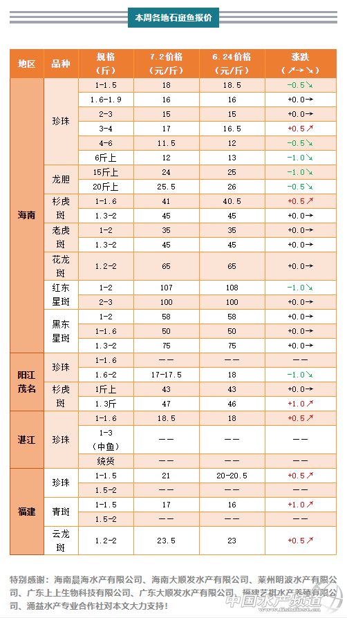 | 中國水產頻道原創報道, 慘!谷底下跌,石斑魚價格不升反降 文/水產前沿何鴻浩 行情簡析 福建:本周福建石斑魚價格略有上漲,但幅度不大。當地從業者表示,珍珠價格漲不動,反而是青斑略有回暖,一斤上漲0.5元至1元左右。但總的來說,福建石斑魚價格仍然平穩,預計還要震蕩很長一段時間。 廣東:本周廣東石斑魚價格有漲有跌,地區趨勢大不相同。湛江業者表示,魚價略有上漲,交易量還行,但就是價格漲不起來。沒有婚宴、酒席,石斑魚價格很難漲起來。陽江、茂名從業者表示,近期交易量平穩,珍珠一般幾天一車,約6000斤;衫虎更少,一車約2000斤,市場所需的消化時間更長。整體來看,價格不漲反降。 海南:本周海南石斑魚整體下跌。當地業者表示,原以為今年魚價已經跌到了谷底,結果還能往下跌,6斤上規格甚至跌至12元/斤,今年的魚價真的是太慘了。 |