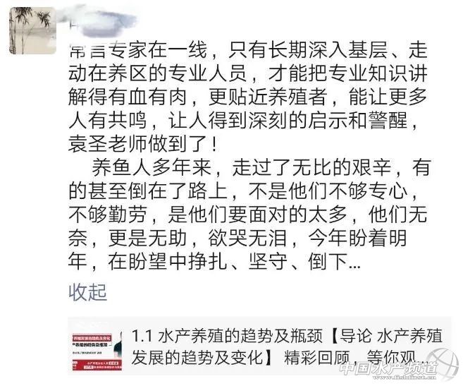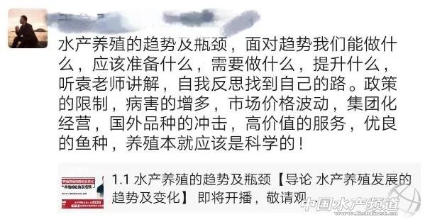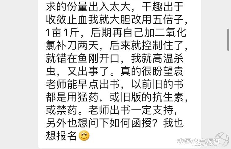 | 中國水產(chǎn)頻道獨家報道, 2個月快速掌握漁病知識與技能!《袁圣·你應該了解的漁病知識·初級》,7月限時狂歡大促中~ 文/水產(chǎn)前沿李曉欣 《袁圣·你應該了解的漁病知識·初級》 2個月快速掌握漁病知識與技能 7月限時大促中! ↓↓↓ 自6月8日起每晚19:30,水產(chǎn)前沿特邀江蘇農(nóng)牧科技職業(yè)學院教師、職業(yè)執(zhí)業(yè)獸醫(yī)師袁圣老師,開設《你應該了解的漁病知識·初級》系列云課,9大專題,共計59講,每晚上線1講,截至目前(7月2日)已經(jīng)上線了24講。 系列云課上線后人氣爆棚、好評如潮,許多養(yǎng)殖戶、技術員、一線漁醫(yī)等水產(chǎn)從業(yè)人員報名收看了課程,更有多家企業(yè)、單位自發(fā)團購,積極發(fā)動公司員工“進修”,大家紛紛表示收獲良多~以下截圖自袁老師系列課的交流群: 此次系列云課更是得到了業(yè)界多位資深實戰(zhàn)專家、企業(yè)大咖的傾情推薦,萬分感謝!以下為部分摘選: 華中農(nóng)業(yè)大學陳昌福教授 袁圣老師是我非常熟悉的一位年輕有為的老師,既具有理論知識,又有實踐經(jīng)驗,說實在的,在我們國家這么年輕又有實干精神的老師還真不多了,大家有機會能夠聆聽他的課程應該是非常幸運的。 蘇州大學葉元土教授 漁病防治是一項復雜的系統(tǒng)工程,既需要科學的診斷技術,也需要精準的用藥方法,還需要實戰(zhàn)經(jīng)驗的指導。我與袁圣老師有過長時間的合作交流,他是一位帶草帽跑魚塘的專家,幫助過很多的養(yǎng)殖戶挽回了重大的經(jīng)濟的損失,是值得我們尊敬和喜愛的一名科學家。我既是袁圣老師的粉絲,也是水產(chǎn)前沿的忠實粉絲,水產(chǎn)前沿更是我們?nèi)w水產(chǎn)人的共享平臺。本人極力推薦大家,6月8號以后每天晚上7點半,大家看完新聞聯(lián)播后就鎖定水產(chǎn)前沿直播間,收看袁圣老師的系列課程。大家多學點漁病知識,減少養(yǎng)殖損失,多賺點錢,謝謝! 四川農(nóng)業(yè)大學汪開毓教授 目前我國水產(chǎn)行業(yè)就正缺這么一部比較系統(tǒng)完整,由基礎入門到逐步提高精通的系列魚病視頻教程。當前我國水產(chǎn)養(yǎng)殖因病害發(fā)生造成的損失很嚴重,在生產(chǎn)一線的許多從事魚病診療技術人員,正需要有個系統(tǒng)地培訓和提高,尤其是理論和實踐的結(jié)合,實際案例的規(guī)范操作示范示教,這樣才能真正實現(xiàn)培訓提高魚病診療技術水平的目的,袁圣老師的這套系列課程為魚病診療入門打基礎,是通向漁醫(yī)行家很好的學習階梯。 中國漁業(yè)協(xié)會水產(chǎn)養(yǎng)殖投入品分會會長、江蘇天石生物科技有限公司總經(jīng)理邢華 當前已經(jīng)進入到水產(chǎn)病害高發(fā)時期,面對著廠家五花八門的所謂技術服務,事實上藥害事故也頻頻發(fā)生,養(yǎng)殖業(yè)者無可適從,亟需有經(jīng)驗、有理論的實戰(zhàn)獸醫(yī)幫助,袁圣老師就是這樣一位有豐富實戰(zhàn)經(jīng)驗及扎實理論基礎的好獸醫(yī),他的講課既有趣味性又有實戰(zhàn)防病技術指導性。 海大集團華東區(qū)副總裁、南通海大生物科技有限公司總經(jīng)理繆建海 當前正是魚病肆虐、氣候多變的時候,我們看到市場上有很多令人心痛的發(fā)病案例,也看到養(yǎng)殖戶面對魚病時的束手無策,病急亂投醫(yī)、亂用藥,最后反而導致治療效果不好,極大地影響了養(yǎng)殖節(jié)奏和養(yǎng)殖效益,出現(xiàn)這樣的問題,深層次的原因是養(yǎng)殖戶朋友缺乏對魚病理論體系及魚藥理論知識的認知。袁圣老師長期奔走在養(yǎng)殖一線,具有非常豐富的理論體系和實踐經(jīng)驗,相信在收看袁圣老師的系列課程后,對您在養(yǎng)殖生產(chǎn)、日程管理等方面會有比較大的好處,請不要錯過, 江蘇世昌農(nóng)牧股份有限公司董事長袁珍虎 早預防、早診斷、早治療是防治漁病的關鍵,袁圣老師具有豐富的理論知識和實踐經(jīng)驗,是一位接地氣的專家,在大江南北解決了很多養(yǎng)殖戶的技術難題,深受農(nóng)戶喜愛。 無錫三智生物科技有限公司總經(jīng)理蔣蓉 近年來養(yǎng)殖動物疾病頻發(fā)造成了很大的損失,但是對漁病的理解還有很多的誤區(qū),如何正確地認識漁病?如何正確地預防與治療?如何進行綠色健康養(yǎng)殖?這里面還有太多的困惑。袁圣老師在漁病防治方面有著豐富的一線經(jīng)驗,請大家鎖定水產(chǎn)前沿直播間由袁圣老師帶來的《你應該了解的漁病知識》系列課程,真正地認識漁病,相信大家都會收獲滿滿。 江蘇祥豪生物科技有限公司總經(jīng)理王大榮 今年全國各地很多養(yǎng)殖魚類品種暴發(fā)性疾病比較嚴重,養(yǎng)戶經(jīng)濟損失很大,6月8日開始每晚7點半,請大家鎖定水產(chǎn)前沿直播間,傾聽一線水產(chǎn)漁醫(yī)袁圣老師講魚病。 …… 比你優(yōu)秀的人都在努力學習 還不快快上車~ ↓↓↓ 講師簡介 袁圣 江蘇農(nóng)牧科技職業(yè)學院教師,執(zhí)業(yè)獸醫(yī)師,國家大宗淡水魚產(chǎn)業(yè)技術體系南京綜合試驗站及江蘇現(xiàn)代農(nóng)業(yè)(鮰魚)產(chǎn)業(yè)技術體系病害防控創(chuàng)新團隊成員,中國漁業(yè)協(xié)會水產(chǎn)投入品分會專家委員會委員,長期在養(yǎng)殖一線從事魚病防治工作,對常見魚類病害有較深的理解。 課程亮點 ■打破時空界限:足不出戶,2個月快速