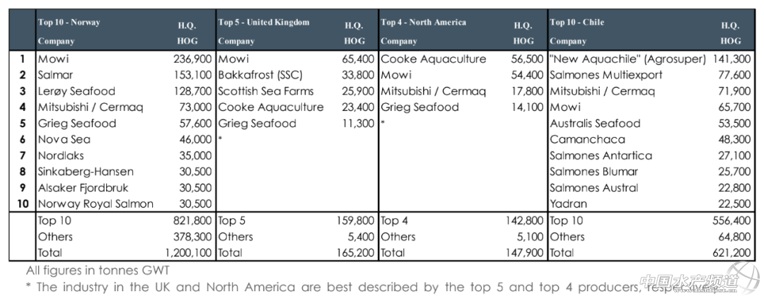 | 中國水產頻道原創報道, 文/海鮮指南(seafood-guide)沈基文 近日,全球最大的三文魚生產商美威(Mowi)發布了2020全球三文魚行業手冊。 2019年,全球三文魚產量增長了6%,其中,挪威增長了6%,智利增長了8%,英國(蘇格蘭)增長了2%,北美(加拿大)增長了2%,其他地區(包括法羅群島、愛爾蘭、澳大利亞塔斯馬尼亞、冰島和俄羅斯)增長了7%。 這幾個產區供應的市場有些區別,挪威產區主要供應歐盟、俄羅斯(尤其是2014年俄羅斯禁止以前)和亞洲;智利三文魚主要供應美國、南美和亞洲;加拿大主要供應美國;蘇格蘭三文魚主要在自己本土市場消耗(編者注,也有少量出口到歐盟市場)。 由于各國之間貿易和航空的便利,養殖三文魚主流通產品形式還是以冰鮮為主,同時由于地理和時空的關系,這也增加了冰鮮三文魚流通的時間和成本,冰鮮三文魚行情起伏也因此而產生。 在消費市場上,全球的消費需求增長了7%,其中,巴西和亞洲增長喜人,達到15%和12%,其次是美國10%,再就是歐盟5%,俄羅斯在2019年消費養殖三文魚下降了2%。 歐洲(包括俄羅斯)和北美仍然是全球最大的養殖三文魚消費市場,但是新興市場的增速不得不讓人注意到,而且這些新興市場的價格還比傳統市場的價格要高。 除冰鮮以外的最大加工產品——煙熏三文魚,煙熏三文魚最常見于歐洲,歐洲煙熏三文魚(以大西洋鮭為原料)的市場在2019年達到256,500噸,其中德國和法國為最大市場。假設煙熏三文魚從原料到成本的出成率是50%,這就意味著歐洲在2019年消費了128,250噸煙熏三文魚產品。 過去幾十年中,有一個趨勢很明顯,就是收購、合并的趨勢,全球三文魚頭部企業都擁有著完整的產業鏈和供應體系。挪威和智利的生產商有期明顯,挪威三文魚生產商的前十名的產量總和占據了挪威三文魚總產量的70%,而智利官方頒布的三文魚養殖許可證里,83%的許可證由智利的前十名三文魚生產商擁有。 以下是挪威、智利、蘇格蘭、加拿大主要三文魚生產商名單及2019年產量詳情: 全球大西洋鮭生產商前五名為美威、賽馬克、薩爾瑪、智利愛閣(智利AQ)以及挪威萊瑞。 2019年頭部生產商與2018年幾乎沒有區別。 |