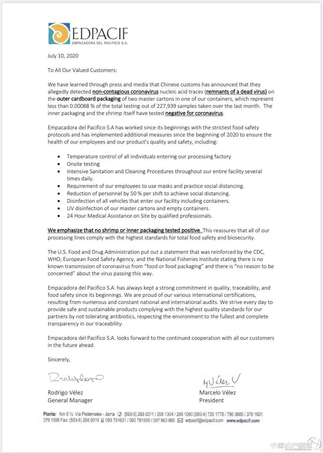 | 中國水產頻道原創報道, 7月13日,厄瓜多爾總統緊急考察涉事工廠,三家封禁企業均作出回應,呼吁業界理性對待! 文/海鮮指南(seafood-guide)李帥 厄當地蝦價暫時并未因封禁事件造成影響 注:以上產品為當地蝦類的塘頭收購價,匯率按當地貨幣實時兌換人民幣計算 (CNY表示人民幣,USD表示美元) 7月14日,海鮮指南收到海外最新蝦價,數據顯示,厄瓜多爾當地蝦價并未因封禁事件造成影響,工廠給出的收購價格依然堅挺,并未繼續落價。 厄總統莫雷諾緊急考察桑塔對蝦加工廠!涉事三家企業均回應! 在7月13日,為檢查厄對蝦是否符合本國和國際衛生安全標準,厄總統莫雷諾于13日上午赴瓜亞基爾市Santa Priscila對蝦加工廠進行實地考察。政府部長羅莫,生產、外貿、投資和漁業部部長翁塔內達以及國家水產養殖協會主席坎波薩諾陪同考察。 厄瓜多爾總統莫雷諾視察桑塔工廠 涉事三家工廠均作出回應! 同日,涉事的三家公司其中的兩家藍泰、太平洋對外公開發布聲明,承諾對外出口的蝦產品符合相關進出口的法律和規定,對安全性有信心。 兩家公司聲明 厄瓜多爾政府確認出口食品符合所有生物安全條例! 7月11日,厄瓜多爾國家政府通過生產、外貿、投資和漁業部,確認厄瓜多爾的出口產品,特別是食品類出口產品,符合國家法規及國際準則規定的所有生物安全條例。正因如此,即便在全球疫情蔓延期間,厄瓜多爾得以始終保持向全球不同市場供應產品。 厄瓜多爾駐華使館本周五收到中華人民共和國海關總署來函,函中告知在厄瓜多爾輸華凍蝦的外包裝和集裝箱內壁上檢出新冠病毒陽性。關于這一情況,有必要明確以下內容: 中國政府的分析結果顯示,這一發現不構成傳染風險。包括聯合國糧農組織、世界衛生組織、美國疾病控制與預防中心和美國國家漁業研究所等在內的一些世界衛生領域的國際機構進一步證實了這一點。上述機構表示,尚未證實新冠病毒能夠通過食品(包括水產品)或食品包裝進行傳播,因此它們在病毒的蔓延中并不起到傳播作用。 中國海關的通知并不意味著對厄瓜多爾的制裁,也不構成針對厄瓜多爾蝦產品的制裁。函中指出,鑒于中厄兩國間的友好關系,病毒檢出陽性后,已暫停三家相關企業的對華出口,而非采取廣泛的禁止措施。 中國海關的信息表明,共檢測樣本227934個,包括產品樣本43964個,內外包裝樣本147568個,環境樣本36402個;結果顯示,1個集裝箱內壁樣本和5個蝦產品外包裝樣本檢出病毒核酸陽性。包括凍蝦蝦體在內的其余檢測結果均為陰性。中國政府專家認為,檢出結果不代表具有傳染性。 水產養殖和漁業副部-質量和安全司持續對該產業的全生產鏈進行控制和監測,確保其嚴格遵守《國家安全計劃》(2006年起生效,與《國際食品法典》和危害分析與關鍵控制點(HACCP)體系相關)、國家緊急行動委員會的《生物安全衛生條例》(關于預防新冠病毒和保障食品安全的指南)和第MPCEIP-2020-0071號部長協議。該協議指出,要“加強必要措施,以符合漁業及水產業的必要程序、條例及其他規范要求,預防和控制漁業及水產業工作人員感染新冠病毒的風險”。 厄瓜多爾國家政府再次表示愿意解決國內外相關管控當局提出的所有關切,以確保厄瓜多爾出口食品的安全和生物安全;重申我國在國際層面同主要貿易伙伴保持的良好關系;并承諾將會一如既往地同中國當局保持密切聯系,配合進行一切必要核查,強化相關進程。 2020年7月11日,基多 生產、外貿、投資和漁業部 厄瓜多爾駐華大使館原文鏈接: |