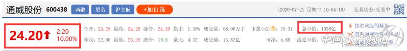 | 中國水產頻道原創報道, 通威股份成為目前全球資本市場第二家市值破千億的光伏企業,也是國內首家市值破千億的水產料企業 文/水產前沿唐東東 剛剛,通威股份率先跑入千億俱樂部!7月21日,通威股份股價再度漲停!其市值也因此首次突破1000億元,達到1038億元。由此,通威股份成為目前全球資本市場第二家市值破千億的光伏企業,也是國內首家市值破千億的水產料企業。 從企業發展戰略而言,通威股份以“新能源”和“農業”兩條腿走路,并通過“漁光一體”實現雙主業的協同效應,力求成為世界級健康安全食品供應商和綠色能源供應商。盡管通威股份在2004年便已成功登陸資本市場,但其市值在2016年之前都處于100億元以下,而隨后開啟了飆漲的節奏,不斷邁過100億、200億、300億……1000億關口。尤其是2019年以來的增速最為迅猛,從歷史數據可以看出,2019年1月2日時通威股份的市值僅355億元。 我們來看下通威股份在2016年之后到底發生了什么?這一年也是通威股份開始布局光伏產業的元年,在此之前,水產料等農牧相關產品是其主要的利潤來源。在光伏新能源上,通威股份以高純晶硅、太陽能電池等產品的研發、生產、銷售為主,形成上中下游產業鏈的貫通。公開資料顯示,自2016年進入光伏領域以來,通威股份光伏三大主營產品均一直保持增長趨勢:太陽能電池片和組件業務成為通威股份第一個破100億元大關的光伏產品,2019年收入為122.71億元,同比增長了60.56%;隨著高純晶硅在建工程的逐步投產,其高純晶硅業務收入2019年也增長了56.11%至51.79億元;2019年通威股份光伏發電業務收入同比增長76.19%至10.93億元,是其當年增長最快的主營業務。截止2019年末,通威股份有8個重大光伏在建工程,投資預算合計達135.25億元,涉及5萬噸高純晶硅產能、9.3GW高效太陽能電池產能、474MW光伏電站項目。 盡管通威股份在光伏領域已處于全球領先水平,但仍計劃不斷擴增規模和提升效率來夯實其行業地位。據公開資料顯示,2020年通威股份高純晶硅業務將力爭實現9萬噸的產銷量,太陽能電池業務力爭實現20GW以上產銷量;光伏發電業務預計新增投資建設“漁光一體”項目1GW以上。同時,通威股份將通過信息化手段提升單晶料比例并維持在90%以上,并根據市場需求,擴大N型料供應比例。生產成本方面,永祥多晶硅生產成本降低到5萬元/噸以下,永祥新能源和內蒙古通威生產成本穩定在4萬元/噸以下,遠低于行業平均水平,以強悍的降本增效能力使其具有顯著的競爭優勢。 市場的布局也仍在強勢進擊。進入2020年以來,通威股份已連續發布了4個擴產項目的公告。其中,2月11日公告稱將投資200億元分期擴產30GW高效太陽能電池及配套項目;3月20日公告稱計劃在云南省保山市投資建設年產4萬噸高純晶硅項目,該項目總投資額為40億元,將于2020年上半年啟動,預計2021年11月底建成投產;4月20日發布公告計劃募集資金不超過60億元,其中主要投資于“年產7.5GW高效晶硅太陽能電池智能工廠項目(眉山二期)”、“年產7.5GW高效晶硅太陽能電池智能互聯工廠項目(金堂一期)”,兩大項目投資額預計51億元。 |