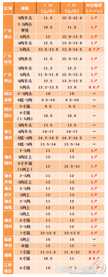 | 中國水產(chǎn)頻道原創(chuàng)報(bào)道, 大魚緊缺,抓魚水車走動(dòng)頻繁,車多貨少!沉默一個(gè)月后黃顙魚再次迎來漲價(jià)潮! 文/ 水產(chǎn)前沿 林貞武 備注:湖北地區(qū)塘頭發(fā)價(jià)暫未較為明朗的發(fā)價(jià),宜昌、武漢少量本地走動(dòng)供應(yīng) 一周要聞 要聞1:大魚緊缺,最高漲3.3元/斤。黃顙魚這兩天又給養(yǎng)殖戶傳來了一個(gè)利好消息!在經(jīng)歷一個(gè)來月的價(jià)格回落之后,本周多個(gè)產(chǎn)區(qū)黃顙魚再次迎來漲價(jià)消息,廣東漲1元/斤,湖北漲1元/斤,湖南漲0.5元/斤,江西漲3.3元/斤,湖州最高賣17元/斤,江蘇最高賣16元/斤! 要聞2:湖北拉魚增多。近幾天安徽、江西、江蘇等外地車往湖北拉魚增多,車多魚少,貨品緊張,魚價(jià)上漲明顯!基本上沒有多大的存塘,廣東新魚還要晚個(gè)把月上市,預(yù)計(jì)最快也要到8月底才有零星出售,四的新魚川內(nèi)預(yù)計(jì)是8月中旬,按照去年價(jià)格走向,業(yè)界表示后市很大可能會繼續(xù)平穩(wěn)上漲。 佛山市金浦飼料實(shí)業(yè)有限公司提供 一周行情分析 廣東佛山黃顙魚本周價(jià)格上漲1元/斤。市場存塘逐步減少,各地黃顙魚緊缺。雜交黃顙魚塘頭價(jià)超3.5兩發(fā)價(jià)為12.5塊/斤,4兩魚頭的塘頭發(fā)價(jià)為12.8-13.5元/斤之間,4兩多頭的塘頭價(jià)為13.5-13.8元/斤,5兩頭的價(jià)格為13.8-14.5元/斤左右,主要是看魚定價(jià),5兩頭普遍價(jià)格為13.8-14元/斤之間,全雄對比普遍雜交一斤便宜一塊來,3.5兩炮頭11.5元/斤。 珠海本周價(jià)格上漲1元/斤。4兩頭塘頭發(fā)價(jià)12.8-13.5元/斤,4兩多頭為13.5元/斤,情況基本上與佛山類似,近期水溫較高,目前市場主流還是走雜交為主。 廣東清遠(yuǎn)本周價(jià)格上漲1元/斤。清遠(yuǎn)現(xiàn)在存塘規(guī)格魚較少,零星幾塘可以出,3兩多12.2元/斤,4兩多13.2元/斤,5兩頭13.8-14元/斤之間。 四川本周價(jià)格維穩(wěn)。成都市場日走貨量保持在7-8萬斤之間,近期出魚“松魚塘”的不少。成都2-3兩的塘頭發(fā)價(jià)為10元/斤,眉山5寸篩發(fā)價(jià)9.5元/斤,6寸篩最高發(fā)價(jià)10.5元/斤,預(yù)計(jì)這段時(shí)間會比較穩(wěn)定。 浙江湖州本周價(jià)格穩(wěn)定。當(dāng)?shù)剡@幾天魚價(jià)波動(dòng)不大,大規(guī)格魚相對比較缺乏。3兩多炮頭的魚塘頭發(fā)價(jià)為13-13.5元/斤左右,4.5兩頭為16-17元/斤。 湖北本周價(jià)格上漲1元/斤。前些受暴雨影響,湖北部分養(yǎng)殖區(qū)域遭遇淹水,養(yǎng)殖戶恐慌拋售出魚價(jià)下跌。本周當(dāng)?shù)睾樗巳ィ捎谥把退荇~,養(yǎng)殖戶恐慌出魚,存塘減少,加上安徽、江西、江蘇等地過來抓魚的大水車增多,車多貨少,魚價(jià)大漲!各地方2-3兩的魚價(jià)格本周為12元/斤,3兩上的魚報(bào)價(jià)為13元/斤,6寸篩12元/斤,上漲1元/斤。當(dāng)前武漢白沙洲市場日走貨量大概為5-6萬斤左右,市場批發(fā)價(jià)比塘頭價(jià)高0.5元/斤。當(dāng)?shù)亓魍ㄉ虠罾习灞硎竞笫袘?yīng)當(dāng)還要漲。 湖南本周價(jià)格上漲0.5元/斤。高溫天氣對廣州來湖南的魚的運(yùn)輸有一定的沖擊,加上廣東黃顙魚存塘減少,對湖南當(dāng)?shù)佤~價(jià)的影響減小,價(jià)格近期應(yīng)該穩(wěn)得住。當(dāng)前6寸篩規(guī)格塘頭報(bào)價(jià)為11元/斤,7寸篩12元/斤,常德批發(fā)市場6寸篩批發(fā)價(jià)11.5元/斤。 福建漳州市場價(jià)格維持穩(wěn)定。二級魚12元/斤,3兩上一級魚塘頭價(jià)為15元/斤。廣西桂平7寸篩塘頭價(jià)為12.5-13元/斤之間,2-3兩12元/斤。 江西南昌本周價(jià)格上漲3.3元/斤。前些天受洪水影響,當(dāng)?shù)乜只懦鲷~,6寸篩魚只賣到10元/斤,近兩天水災(zāi)推出,魚價(jià)回漲,6寸篩魚塘頭價(jià)漲至13.3元/斤,南昌市場批發(fā)價(jià)14元/斤,有養(yǎng)殖戶表示目前市場魚販和水車魚販都催著叫賣魚,當(dāng)前養(yǎng)殖戶有點(diǎn)惜售。 江蘇高郵近兩年增量較大。飼料容量預(yù)測有一萬噸左右,江蘇目前夠規(guī)格上市的魚很少,其中揚(yáng)州4兩頭魚塘頭價(jià)16元/斤,3.5兩頭塘頭價(jià)14元/斤。 2018-2020年湖北武漢3兩上黃顙魚成品魚價(jià)格走勢 佛山市金浦飼料實(shí)業(yè)有限公司提供 |