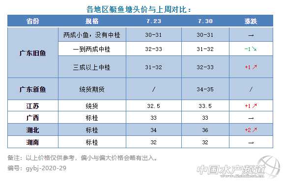 | 中國水產(chǎn)頻道原創(chuàng)報道, 早鱖果然有好行情,新魚比舊魚一斤高出3-5元/斤 文 鱖鱸前沿 李靜 本周開始有人訂鱖魚新魚,大概8月底或9月初抓,統(tǒng)貨34-35元/斤,這個價格相對來說算比較理想。新魚之所以有這么好的價格,主要是由于新魚肥身肉厚,而大部分存塘舊魚由于曾停喂過,所以比較瘦身,且很難再養(yǎng)肥身,所以賣不起價。 今天廣東舊魚比較好規(guī)格的統(tǒng)貨開32元/斤,個別魚塘最高開到33元/斤,大部分訂魚價格在32元/斤以下。現(xiàn)在開塘價格差別比較大,主要看魚的體形和規(guī)格,偏小瘦身的魚也有開29元/斤左右的。整體來說,預計接下來比較緊缺的偏大魚價格看漲,新魚價格也將在近期保持不錯的水平。 本周除了廣東鱖魚中桂成數(shù)高的有上漲外,江蘇高郵統(tǒng)貨也漲了1元/斤,而存塘量比較少的連云港地區(qū)標桂已開到36元/斤;湖北標桂也上漲了2元/斤,開36元/斤;廣西開塘價格也比較亂,標桂以33元/斤為主。湖南鱖魚價格穩(wěn)定,江西、安徽、山東基本上鱖魚已結束。 餌料魚:本周餌料魚價格穩(wěn)定,土鯪價格多在3.8-4.1元/斤,麥鯪價格多在3-3.2元/斤。 |