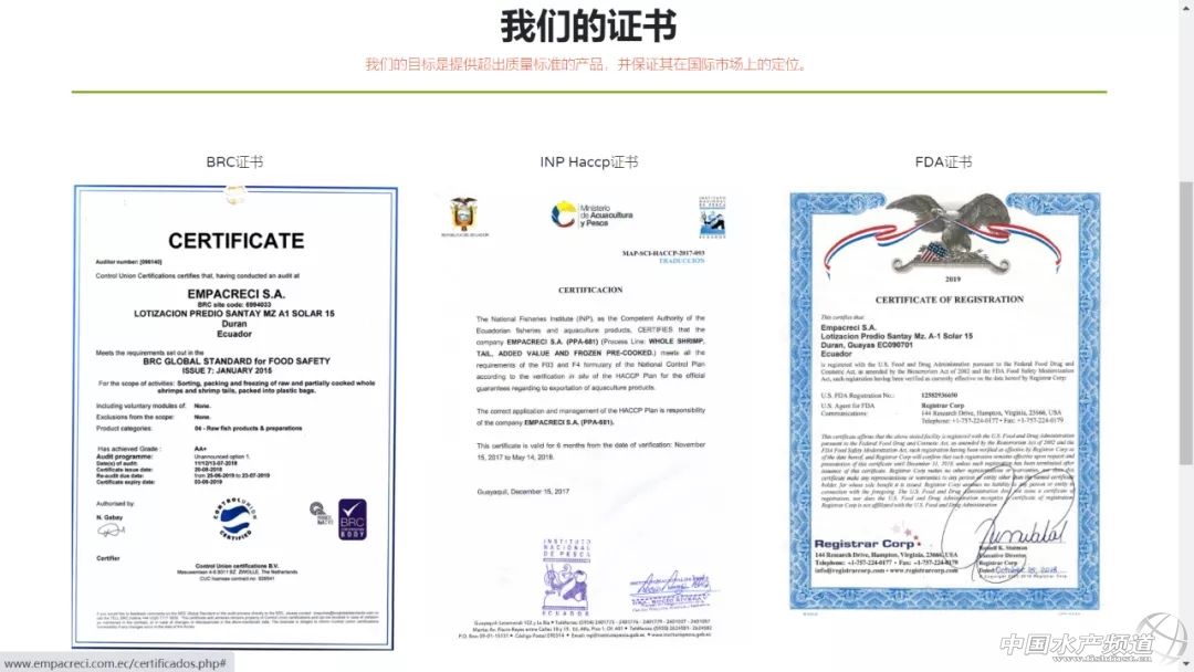 | 中國水產頻道原創報道, 白蝦產業曙光初現! 文/ 海鮮指南 (seafood-guide) 李帥 8月12日,海關總署官網更新厄瓜多爾在華注冊水產品備案名單,編號為681的厄瓜多爾白蝦出口商Empacreci S.A迎來解禁。 Empacreci S.A工廠照 這是繼8月7日桑塔獲得解禁之后,第二家獲得解禁的厄瓜多爾白蝦。在中國市場上,EmpacreciS.A在中國市場上被稱為“藍泰”。藍泰銷售人員告訴海鮮指南,“藍泰成立于2007年,在厄瓜多爾已經有13年的歷史了,專門從事與水產養殖白蝦的加工和出口。” “厄瓜多爾有著近40年的養殖南美白對蝦的歷史,藍泰13年的時間也顯得比較年輕,但我們工廠擁有一流的生產設備,有著熟練地工人,也通過了各項國際認證。” 藍泰白蝦產品 可以預見的是,經過此次風波,中厄雙方有關部門在白蝦的進出口事宜上也更加默契,溝通協作起來更加親密無間,這將有助于未來厄方白蝦企業在中國開展產品銷售經營活動,也方便國內業者清關報關。 其次,疫情防控常態化已經讓厄方企業以及國內從業者都認識到事情的重要性,在接下來的生產中,相信厄瓜多爾白蝦生產商也會提高標準,加大監管力度,中國海關逐步解禁符合規定的厄瓜多爾白蝦工廠,這證實了厄方應對措施的成效,也見證了厄瓜多爾白蝦享譽世界的質量。 目前為止,僅剩下Empacadora Del Pacifico Sociedad Anonima Edpacif S.A(注冊編號654),中國市場稱之為太平洋工廠尚未獲得解禁,預計在不久之后,也將整改完畢,確保企業遵循生物安全議定書。 據海鮮指南了解,為了保證中國市場的供應,確保出口到華的產品都是高品質白蝦,厄瓜多爾8月13日同日與中國海關簽署了一份《厄瓜多爾蝦業出口衛生議定書》,厄瓜多爾方面人員告訴海鮮指南,“這項雙邊文書的簽署,結束了重要且復雜的外交和技術談判,明確了更高效的程序,以改善信息交流并加強檢驗檢疫流程和衛生要求的查驗,為厄瓜多爾向中國市場出口白蝦打開便捷通道。” 厄瓜多爾藍泰白蝦工廠已取得的國際認證 |