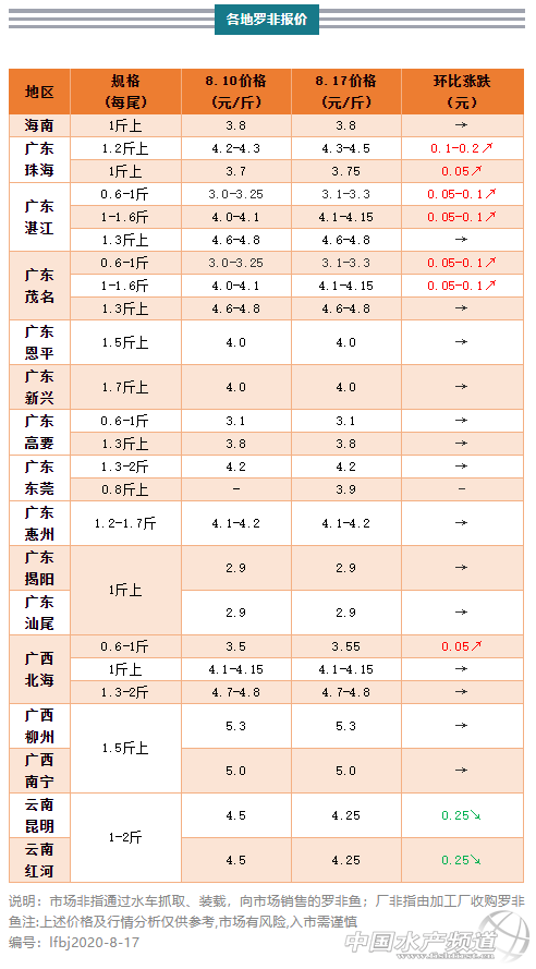 | 中國水產(chǎn)頻道原創(chuàng)報道, 業(yè)者估計10-11月份前,市場都會比較缺魚,羅非有價無市 文/水產(chǎn)前沿葉豐齊 水產(chǎn)前沿專業(yè)為你推送羅非魚 最新價格行情及行業(yè)新聞、各類資訊。 同時歡迎行業(yè)人士踴躍爆料,請掃二維碼聯(lián)系 代表產(chǎn)區(qū)羅非魚行情走勢 一周要聞 海南每天廠非收購量仍有200萬斤左右,但存塘規(guī)格魚開始減少,湛江茂名魚車下來拉魚,后市行情有上升趨勢。 珠三角地區(qū)早段時間魚價便宜,養(yǎng)戶在池塘管理上普遍沒那么到位,投喂率不足,池塘還有很多小規(guī)格魚,加上高溫高密度下,至少死魚五分之一;業(yè)者估計10-11月份前,市場都會比較缺魚,能大量賣魚的養(yǎng)戶可能不多,還得看接下來天氣如何變化。現(xiàn)時天氣狀況較之前好,病魚減少,隨著價格開始走高養(yǎng)戶也愿意增加投喂,但能上市的大魚確實沒多少,基本被本地市場車搶完,剩下1.2斤以下規(guī)格留給工廠。日前,東莞、深圳、惠州三個市場一天大約走魚10萬斤左右,外省魚車再拉10萬斤左右。據(jù)悉珠海有8萬斤左右廠非銷往湛江、茂名加工廠,不過9成藥檢不合格要扣錢。 粵西地區(qū)市場非每天流通量15萬-20萬斤左右,廠非總收購量在30萬斤以上,但僧多粥少不夠分,各廠相約輪流休息。因為小非好價時已出貨將近8成,疏塘后養(yǎng)戶投喂管理沒那么活躍,后期產(chǎn)量起不來,加上近期雨水增多,出魚積極性隨死魚率下降,目前市場上規(guī)格魚少之又少。 廣西規(guī)格魚所剩無幾,市場雖缺魚,但行情應(yīng)保持穩(wěn)定。前期魚價低迷時許多養(yǎng)戶控料,一些水花苗如今剛達到中非規(guī)格,加上今年4月份投放的苗將在10月左右上市,鑒于目前行情較為喜人,養(yǎng)戶傾向加強管理,增加投喂,于9月份投放過冬苗的可能性也大大增加。 云南西雙版納產(chǎn)區(qū)現(xiàn)處于新老魚交替階段,舊魚存塘量不多,約占市場的五分之一,但由于近期旅游人客少,燒烤魚賣不動,羅非有點供過于求。市場魚價基本由經(jīng)銷商主宰,大多會幫養(yǎng)戶賣魚,但批發(fā)價格并不穩(wěn)定,有時昆明市場批10.5元/公斤,有時批8元/公斤。 整體行情綜述 本周多產(chǎn)區(qū)羅非魚價格穩(wěn)定,部分地區(qū)行情繼續(xù)上調(diào),一地跌價;海南地區(qū)各規(guī)格羅非魚價格與上周持平,廠非塘頭收購價上調(diào)0.1-0.2元/斤;珠三角地區(qū),珠海1斤上廠非上調(diào)0.05元/斤,1.2斤上市場非價格上調(diào)0.1-0.2元/斤,新興和恩平1.5斤上市場非價格保持,恩平廠非上調(diào)0.1元/斤,肇慶各規(guī)格羅非價格不變,東莞1.2斤上規(guī)格市場非價格持平,外省車同規(guī)格上調(diào)0.05元/斤,0.8斤抓起3.9元/斤;粵東地區(qū)惠州1.2-2斤規(guī)格羅非價格依然,揭陽和汕尾地區(qū)廠非價格不變,市場非上調(diào)0.3元/斤;粵西地區(qū)湛江和茂名0.6-1斤規(guī)格、1-1.6斤規(guī)格廠非價格皆上調(diào)0.05-0.1元/斤,1.3-1.5斤上規(guī)格市場非保持上周行情;廣西地區(qū)北海0.6斤上規(guī)格廠非上調(diào)0.05元/斤,1斤上規(guī)格廠非以及1.2斤上市場非價格皆不變,南寧1.2斤上、柳州1.5-2斤規(guī)格、欽州及防城港1.2斤上市場非皆保持上周價格;云南地區(qū)昆明和紅河1-2斤規(guī)格羅非價格皆下調(diào)0.25元/斤。 各產(chǎn)地行情分析 海南地區(qū):0.6-1斤規(guī)格廠非收購價2.8元/斤,1斤上規(guī)格廠非3.8元/斤,暫與上周行情一致;不過1斤上規(guī)格廠非塘頭有喊4元/斤的,現(xiàn)金收購價則是3.7元/斤,環(huán)比上周上調(diào)0.1-0.2元/斤。西線市場1斤上市場非塘頭價3.5-3.6元/斤,依然保持上周行情。 珠三角地區(qū):珠海1斤上廠非3.75元/斤,環(huán)比上周上調(diào)0.05元/斤,經(jīng)銷商補貼到3.95元/斤;1.2斤上規(guī)格市場非4.3-4.5元/斤,環(huán)比上周上調(diào)0.1-0.2元/斤;而5-9斤大羅非塘頭價8.5元/斤,保持上周行情。東莞1.2-2斤以上規(guī)格水車走珠三角市場羅非塘頭價4.2元/斤,同上周價格;福建魚車抓4.25元/斤;另外,有外省車抓0.8斤上統(tǒng)貨3.9元/斤。恩平1.5斤以上規(guī)格市場非4元/斤,同上周價格,工廠非6兩上2.9元/斤,1斤上3.9元/斤,環(huán)比上周皆上調(diào)0.1元/斤;新興1.7-1.8斤上規(guī)格市場非到手價4元/斤,同上周價格。肇慶1.3斤上市場非裝車價3.6-3.8元/斤,0.6-1斤規(guī)格廠非2.6-3.1元/斤,1-1.6斤規(guī)格3.55元/斤,1.6斤上3.3元/斤,皆與上周行情一致。 粵東地區(qū):惠州1.2-2斤規(guī)格走本地市場羅非上午車4.1元/斤,規(guī)格偏小,而下午車4.2元/斤,皆同上周價格。揭陽和汕尾目前魚不多,1斤以上規(guī)格廠非(走汕尾本地凍廠)塘頭價2.9元/斤,暫同上周,而1-1.2斤上規(guī)格市場非3.6-3.7元/斤,環(huán)比上周上調(diào)0.3元/斤。 粵西地區(qū):湛江、茂名兩地1.3斤抓起,普遍抓到1.7斤上規(guī)格市場非4.6-4.8元/斤,保持上周價格。加工廠方面0.6-1斤規(guī)格廠非3.1-3.3元/斤(5成3.3),環(huán)比上周上調(diào)0.05-0.1元/斤,不過據(jù)悉有些廠開價3.3-3.4元/斤;1斤上規(guī)格,湛江和茂名4.1-4.15元/斤,環(huán)比上周上調(diào)0.05-0.1元/斤,1.6斤上規(guī)格超50%收購價甚至可去到4.4元/斤,而藥殘僅扣錢不拒收。 廣西地區(qū):北海0.6-1斤規(guī)格廠非3.1元/斤,加成后最高3.55元/斤,環(huán)比上周上調(diào)0.05元/斤,1斤上規(guī)格廠非4.1-4.15元/斤,同上周價格,市場非1.2-2斤